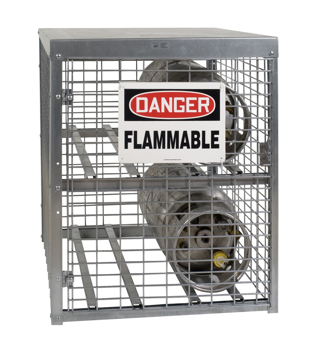 Galvanized Horizontal Cylinder Storage 4 Cylinder Capacity GrayStore LP tanks horizontally and acetylene tanks vertically in this heavy-duty Galvanized Cylinder storage cabinet. Made of all steel construction, this rust resistant cabinet has galvanized welded wire sides with sturdy square steel angle frames and a durable galvanized steel roof. The galvanized rust resistant finish stands up to harsh outdoor environments. Features a "danger flammable materials" sign, and all necessary hardware. Meets OSHA requirements.