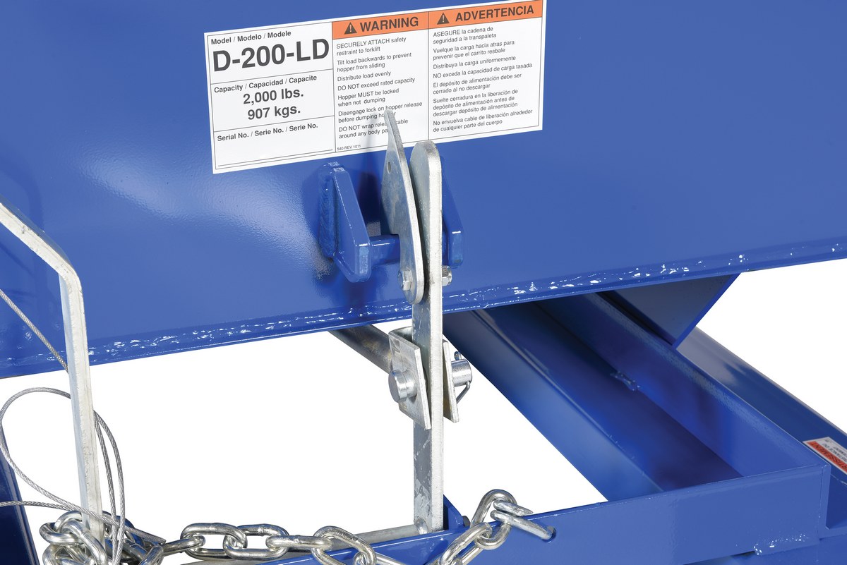 This Light Duty self-dumping steel Hopper with bumper release is ideal for the manufacturing and distributing facilities. The Hopper returns to an upright and locked position automatically after it dumps. Also includes a cable that may be operated from the seat of the fork truck to manually dump the hopper. (Length dimension is measured at top of chute.) Hopper is stackable if you stack the top hopper turned ninety (90) degrees from the bottom. Self-dumping hoppers facilitate compliance with OSHA general industry rule 29 CFR 1910.178(m)(5)(iii) by allowing lift truck operators to remain at the controls of their truck throughout the dumping process.