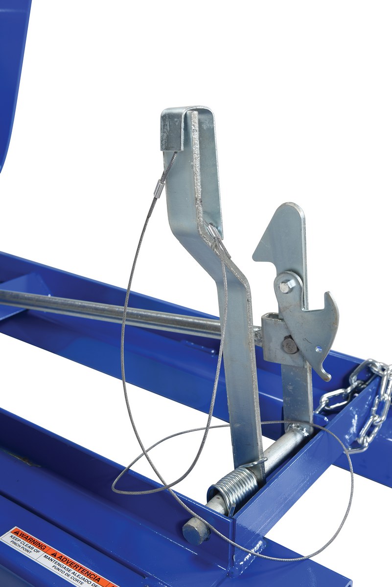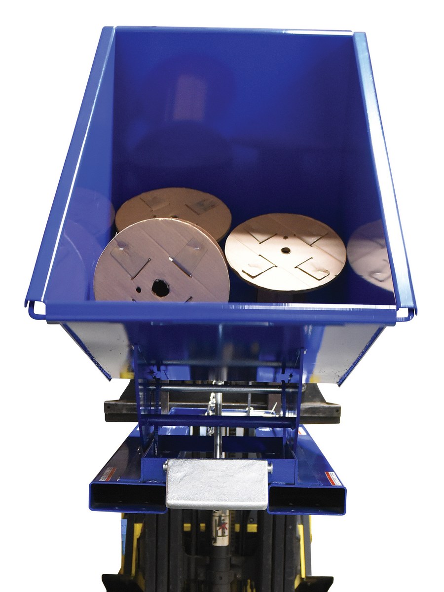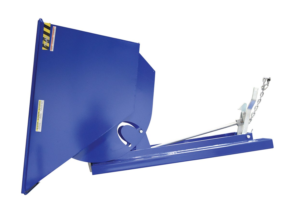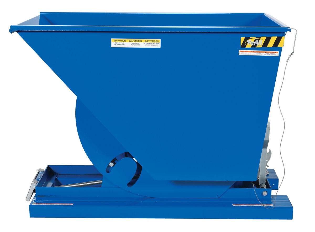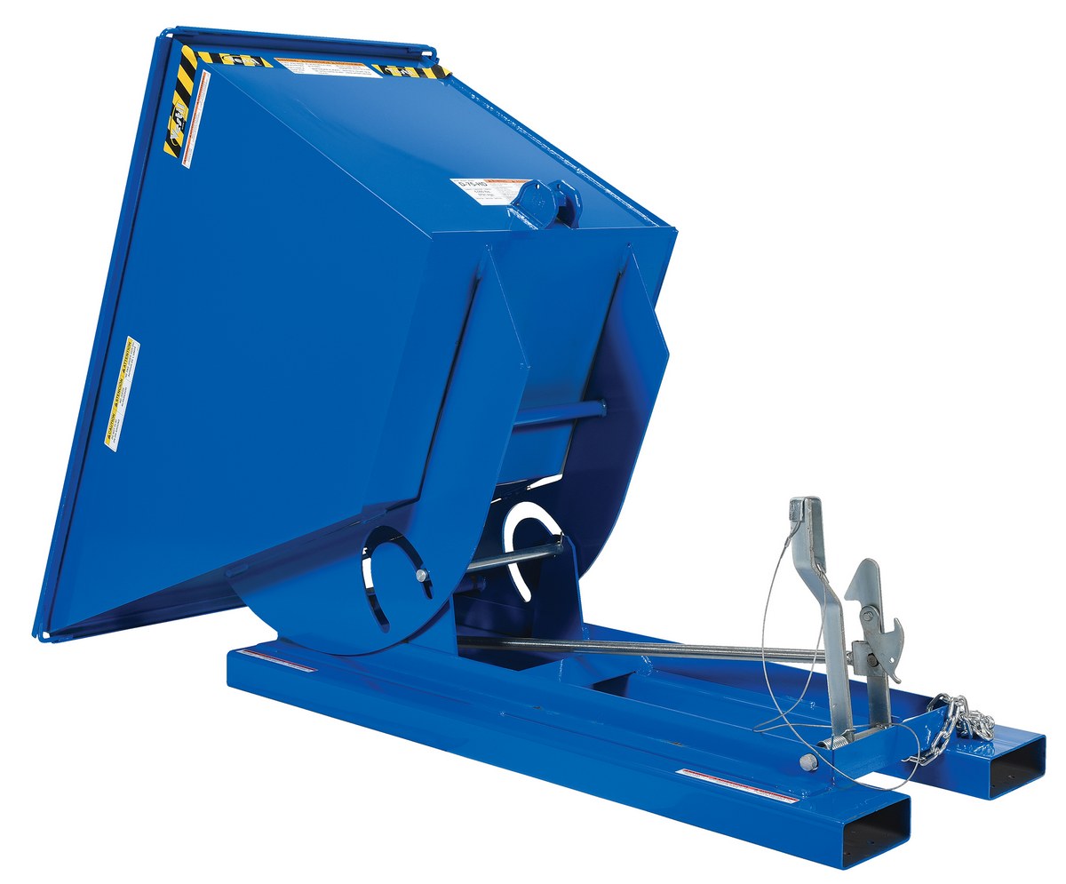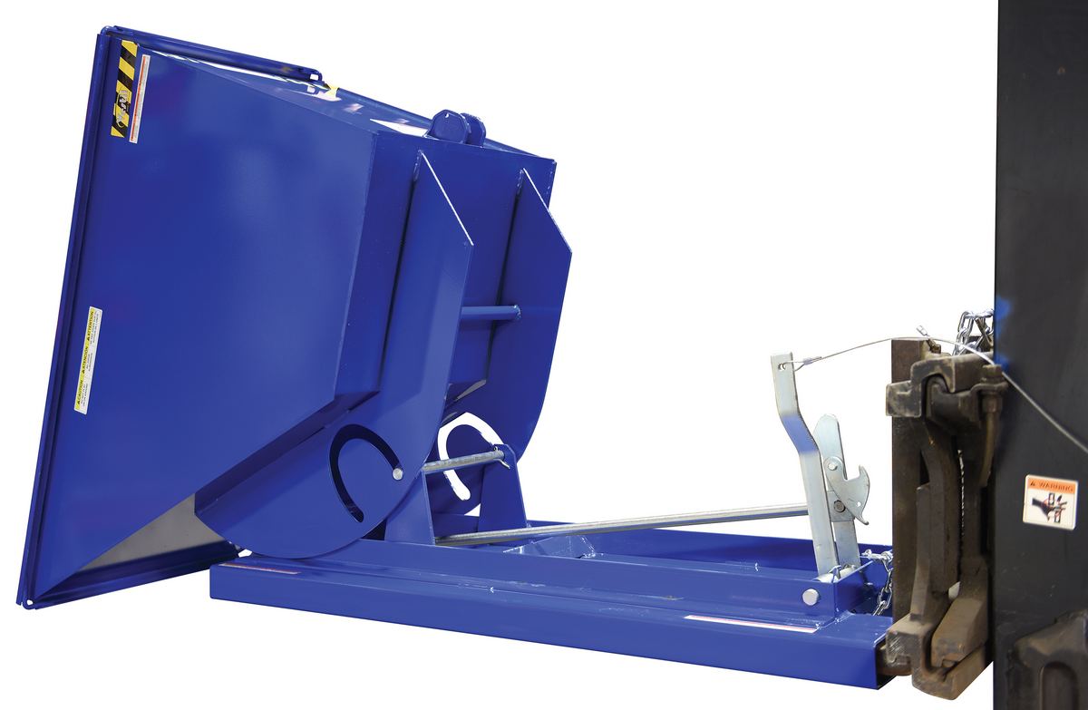 This Heavy Duty self-dumping steel Hopper with bumper release automatically dumps when bumper release contacts the front of the dumpster. Hopper returns to an upright and locked position automatically after it dumps. Also includes a cable that may be operated from the seat of the fork truck to manually dump the hopper. The included safety restraint should be properly secured to a fork truck before dumping. (Length dimension is measured at top of chute.) Hopper is stackable if you stack the top hopper turned ninety (90) degrees from the bottom. Self-dumping hoppers facilitate compliance with OSHA general industry rule 29 CFR 1910.178(m)(5)(iii) by allowing lift truck operators to remain at the controls of their truck throughout the dumping process.