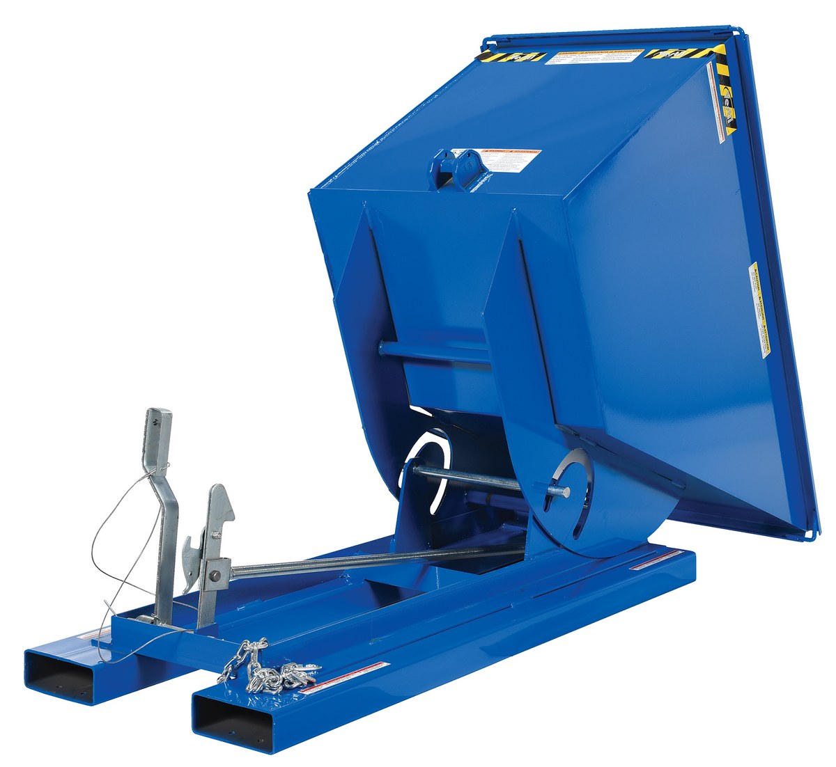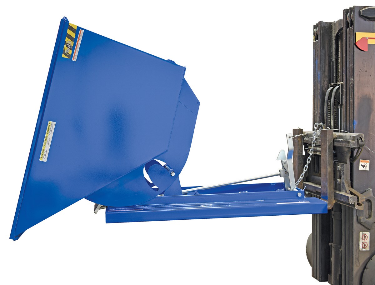 This Light Duty self-dumping steel Hopper with bumper release automatically dumps when bumper release contacts the front of the dumpster. Hopper returns to an upright and locked position automatically after it dumps. Also includes a cable that may be operated from the seat of the fork truck to manually dump the hopper. The included safety restraint should be properly secured to a fork truck before dumping. (Length dimension is measured at top of chute.) Hopper is stackable if you stack the top hopper turned ninety (90) degrees from the bottom. Self-dumping hoppers facilitate compliance with OSHA general industry rule 29 CFR 1910.178(m)(5)(iii) by allowing lift truck operators to remain at the controls of their truck throughout the dumping process.