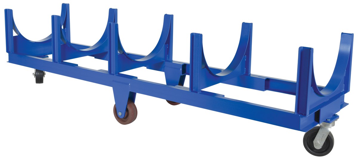Steel Heavy Duty Cradle 123-1/16 In. x 31-1/2 In. x 32-3/8 In. 10000 Lb. Capacity BlueMove and store pipe, channel, bar stock, barrels, or drums with this Heavy Duty cradle cart. A large open design that makes loading and unloading by fork trucks and slings easy. All welded construction. Wheels are mounted in a diamond pattern to allow the truck to tilt when going over thresholds and turn about on its own center. Lightweight Aluminum cradle cart fits all small to medium loads. Powder coat finish standard on steel cart.