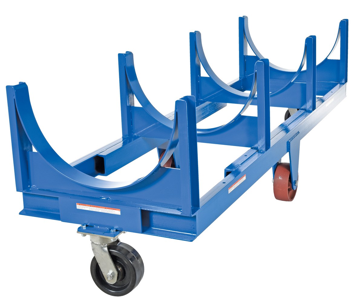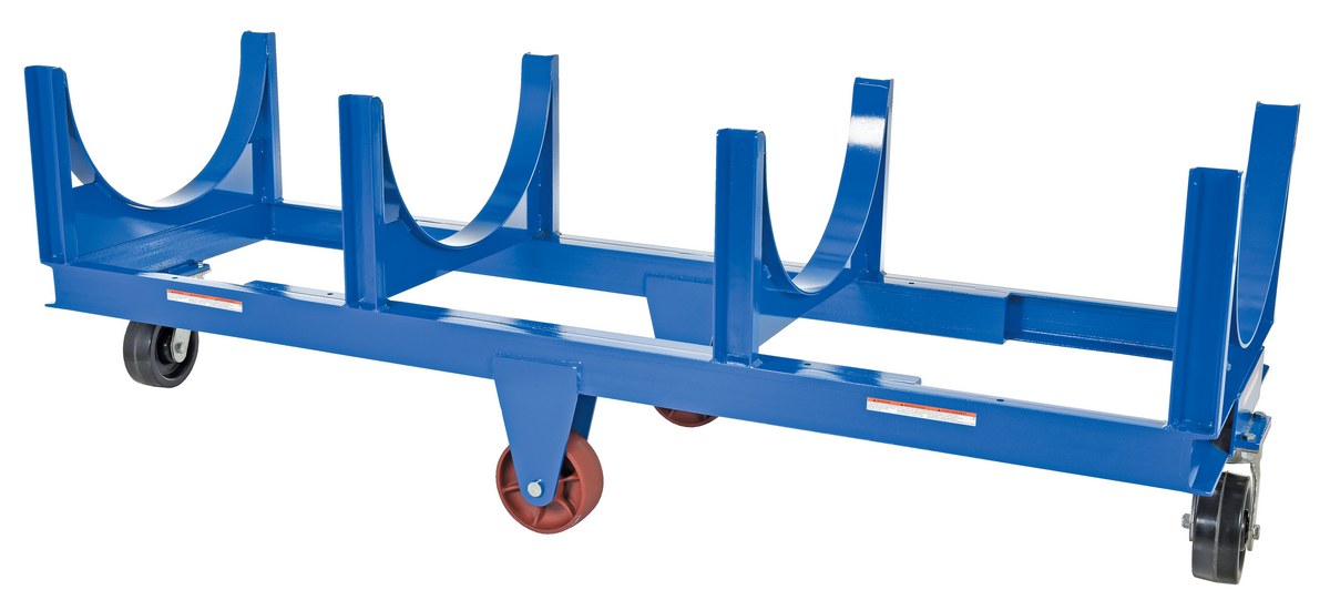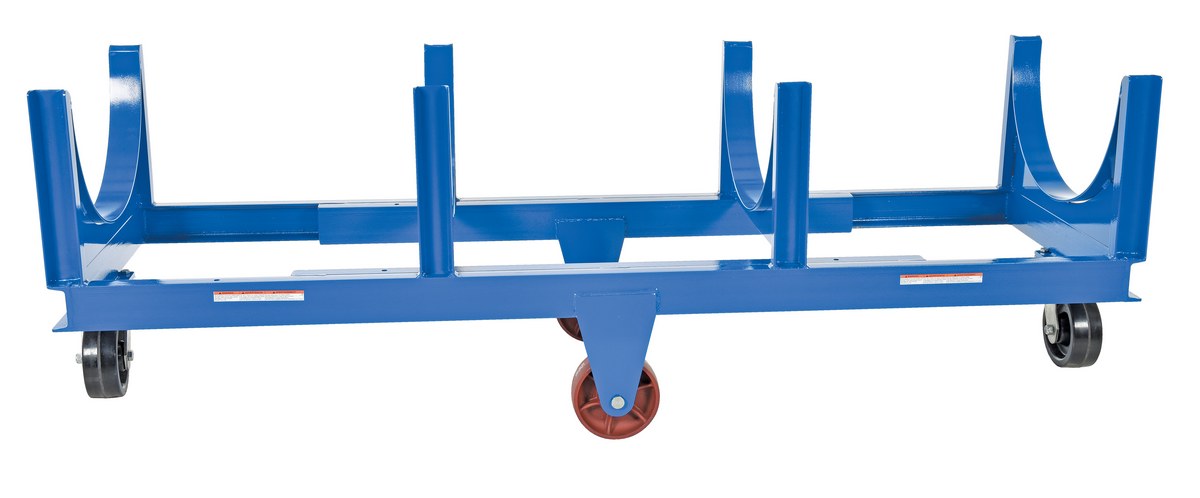 Move and store pipe, channel, bar stock, barrels, or drums with this Heavy Duty cradle cart. A large open design that makes loading and unloading by fork trucks and slings easy. All welded construction. Wheels are mounted in a diamond pattern to allow the truck to tilt when going over thresholds and turn about on its own center. Lightweight Aluminum cradle cart fits all small to medium loads. Powder coat finish standard on steel cart.
