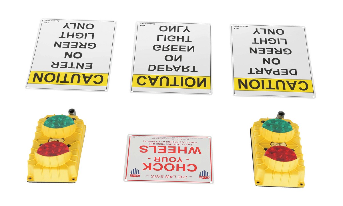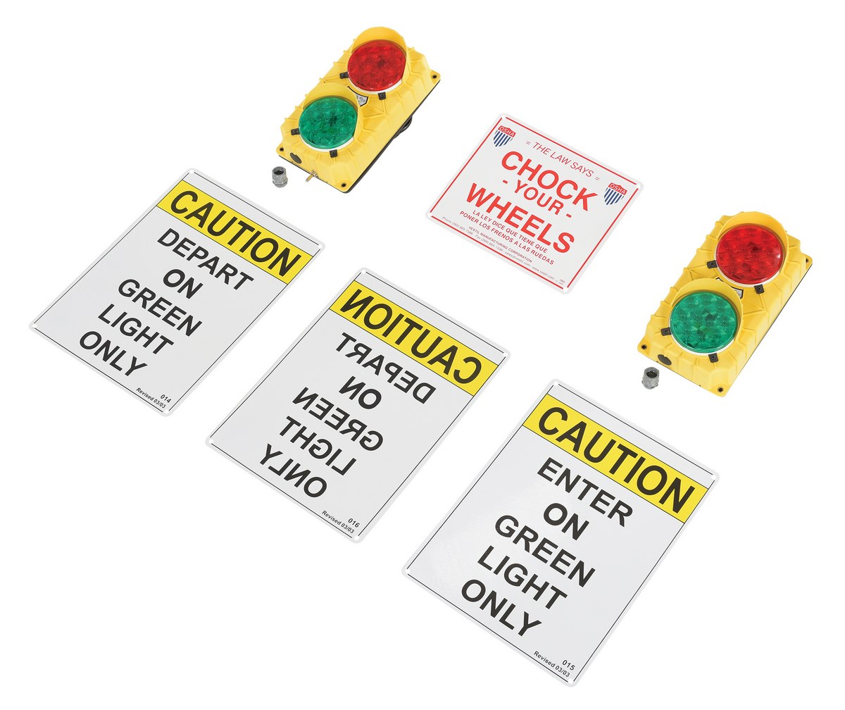 Our dock traffic systems feature flashing red and green lights. Prevent accidents and injuries by providing clear communication between dock personnel and truck drivers. Built-in eyebrow type sun visors increase light visibility. Economy, model DTS-5, comes with two (2) yellow polypropylene traffic lights, 6."W x 11."H, each having a green and a red lens. The light containing a push button is placed inside the dock area for the dock attendant, and the other is placed outside for the truck driver. Four (4) signs are included. LED model never needs bulb replacements.