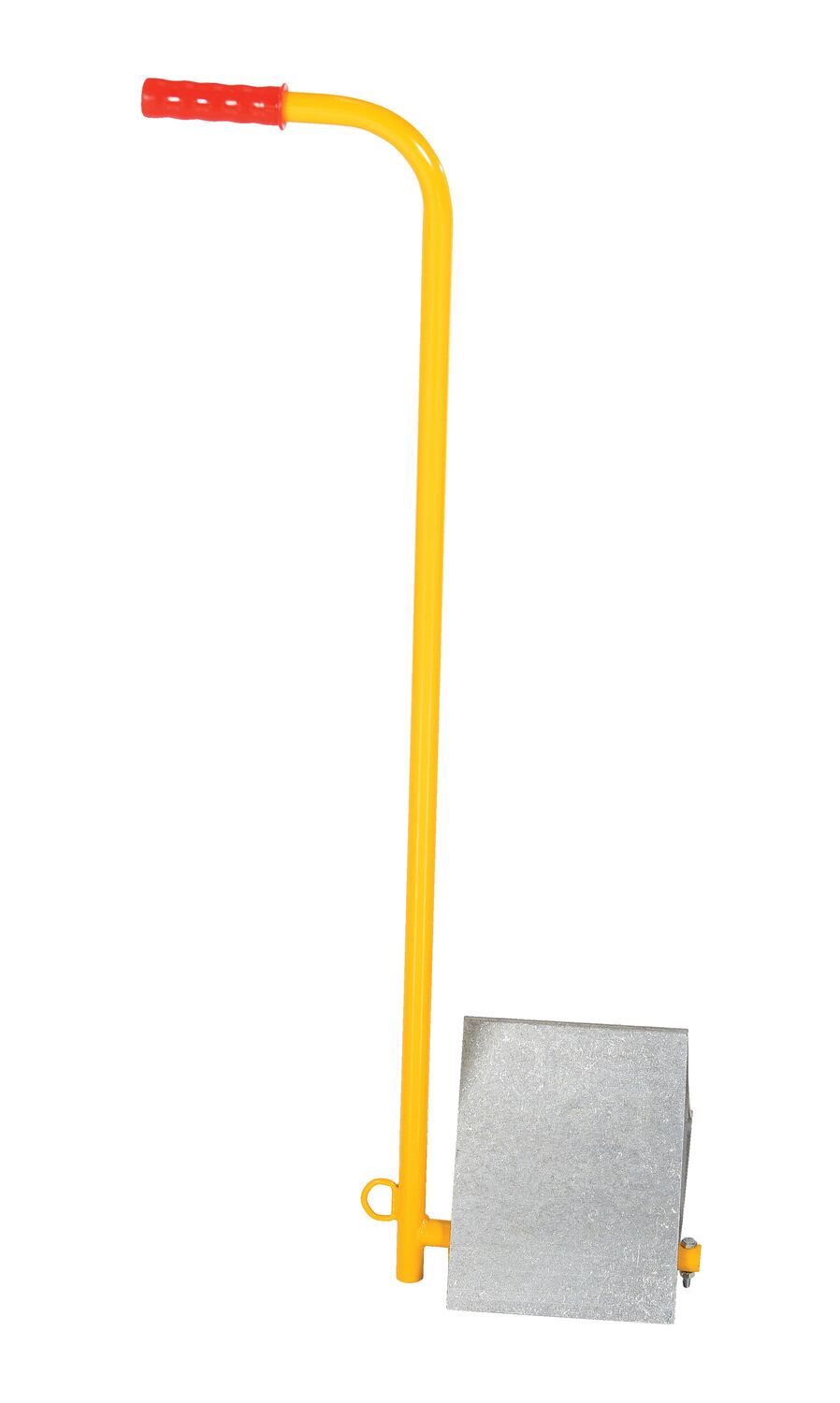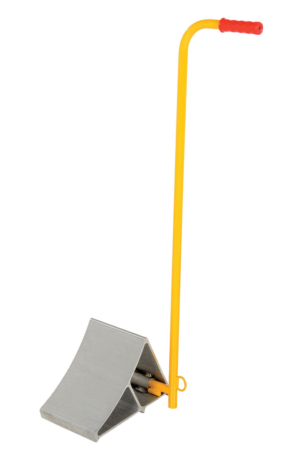 The aluminum wheel chock is ideal for maintenance and industrial facilities. The chock is constructed of extruded lightweight aluminum that is easy to handle. The unit features a serrated top to grip the tire and a triple edged bottom to grip the ground. An extended handle for simple maneuvering is included. D-ring provided for attaching security chain. Chain not included.