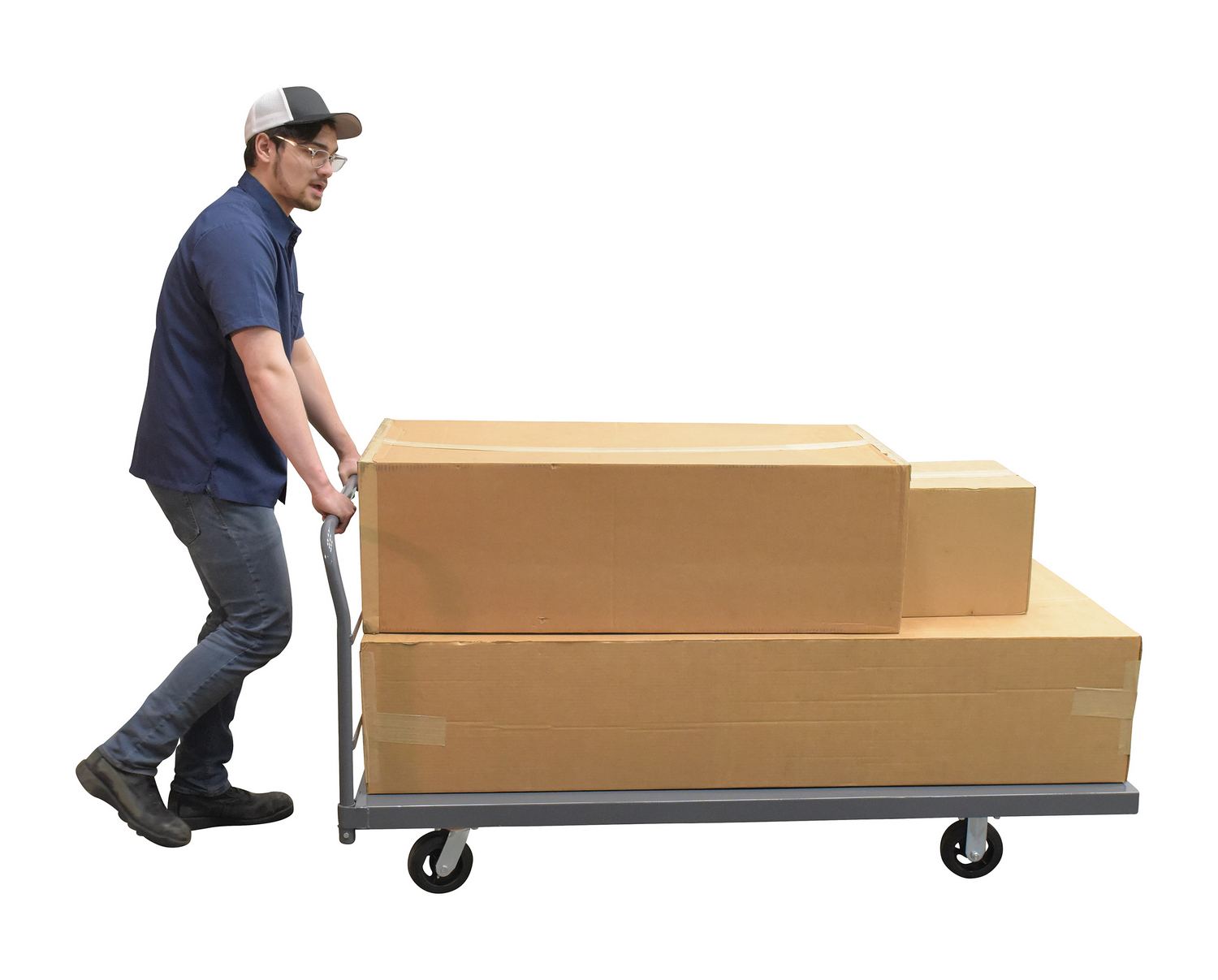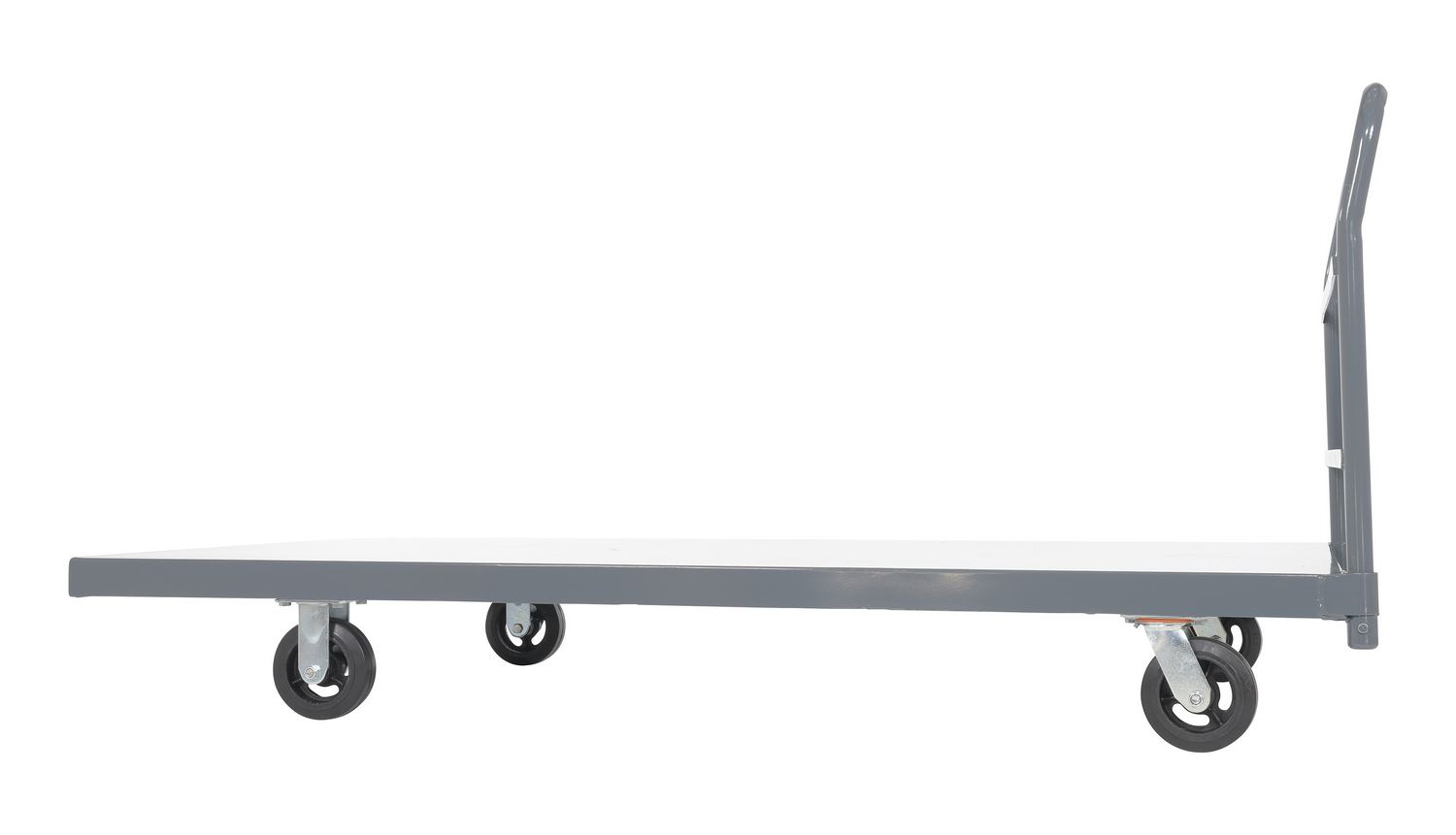 Steel Smooth Deck Platform Truck 36 In. x 72 In. 2000 Lb. Capacity GrayA steel platform truck is the perfect addition to any warehouse or shipping center. The steel platform design provides the user with a better sense of security. With a smooth surface, the amount of abrasion and scuffs during movement is limited. The steel handle allows the user to maintain an ergonomic posture while transferring goods. Mold on rubber casters roll smoothly. Powder coated finish provides added toughness.