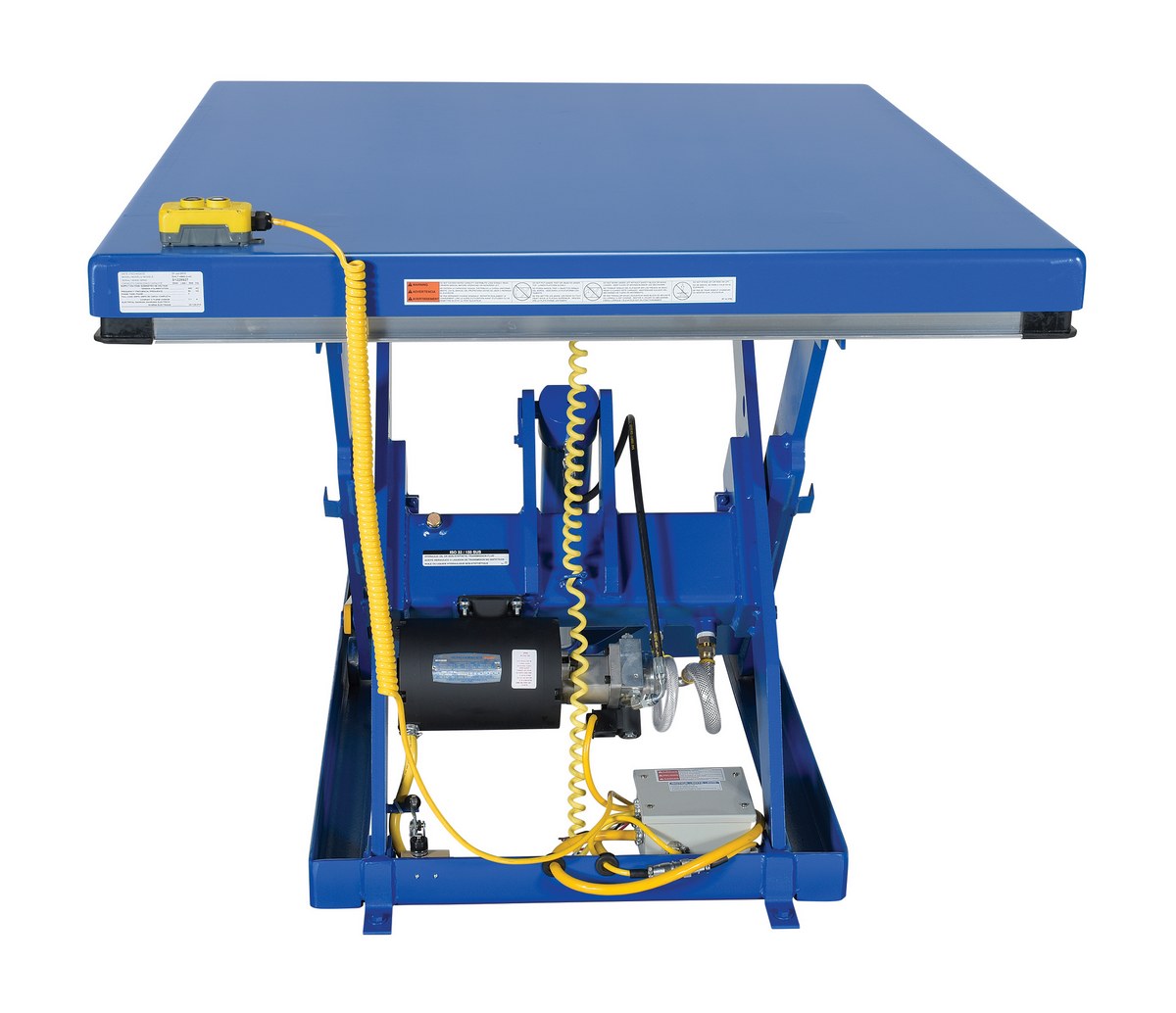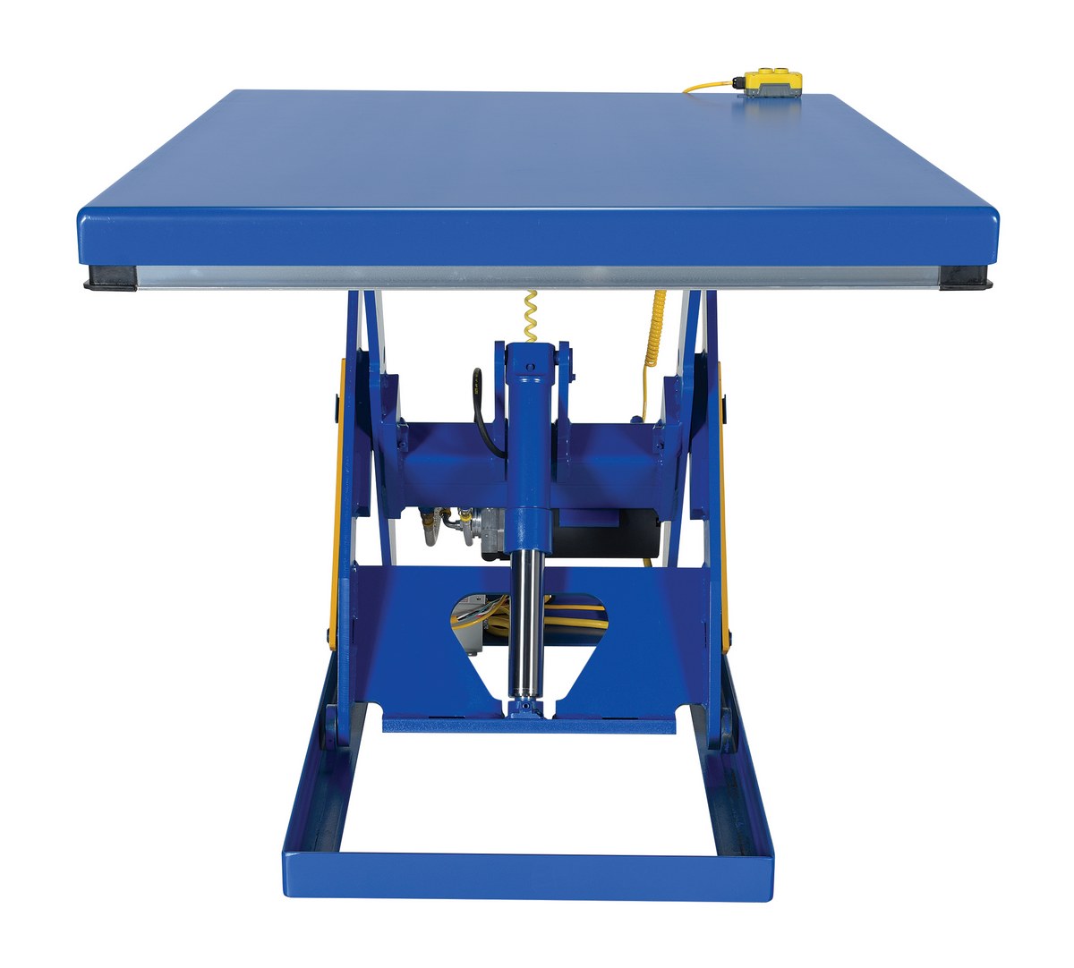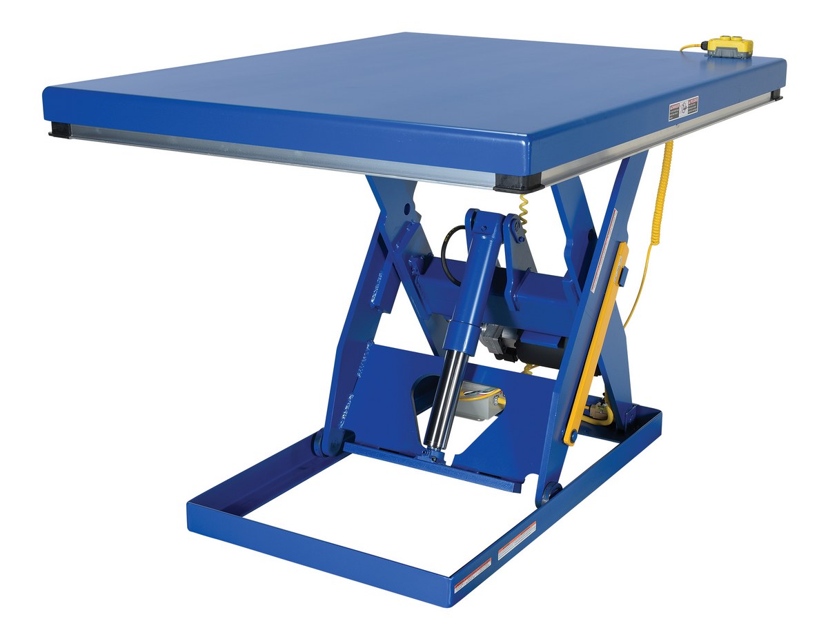 Steel Electric Hydraulic Lift Table 48 In. x 60 In. 2000 Lb. Capacity BlueThe electric hydraulic scissor lift table is used by all types of manufacturing and warehouse facilities. Safety features include a patented pinch point perimeter toe guard to protect pinch points while lowering the table, fused push button control, internal safety velocity fuse to maintain platform height in the event of hose or fitting failure, integral maintenance prop, adjustable upper travel limit switch to stop the table at maximum height, and displacement-style hydraulic cylinders for maximum strength. It also features a pressure plated pump, manifold system, and state-of-the-art lifetime lubricated bearings. The standard 56 frame electric motor is fully enclosed with additional voltage options available. Contact factory if platform dimensions are crucial.