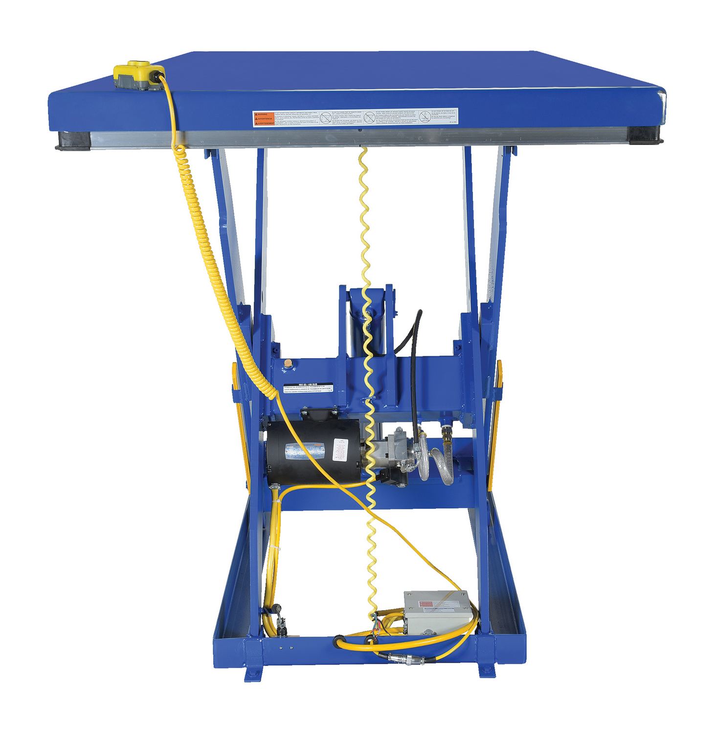 Steel Electric Hydraulic Lift Table 48 In. x 96 In. 2000 Lb. Capacity BlueThe electric hydraulic scissor lift table is used by all types of manufacturing and warehouse facilities. Safety features include a patented pinch point perimeter toe guard to protect pinch points while lowering the table, fused push button control, internal safety velocity fuse to maintain platform height in the event of hose or fitting failure, integral maintenance prop, adjustable upper travel limit switch to stop the table at maximum height, and displacement-style hydraulic cylinders for maximum strength. It also features a pressure plated pump, manifold system, and state-of-the-art lifetime lubricated bearings. The standard 56 frame electric motor is fully enclosed with additional voltage options available. Contact factory if platform dimensions are crucial.