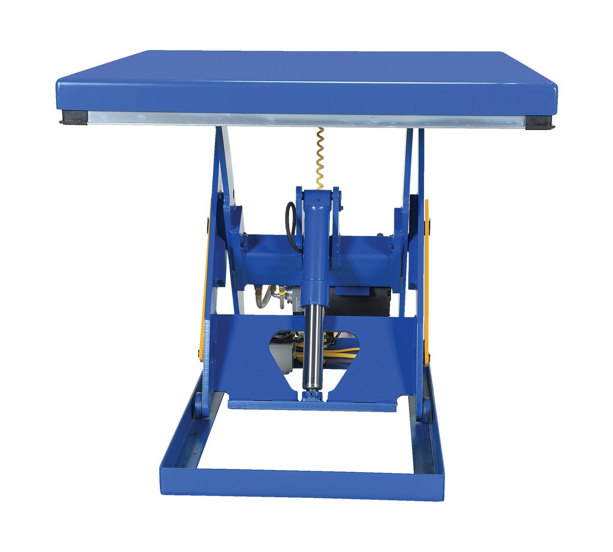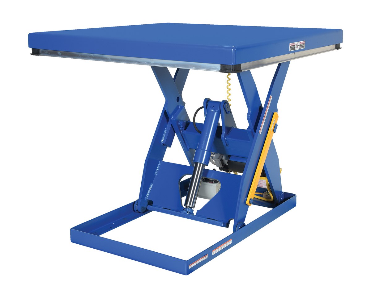 Steel Electric Hydraulic Lift Table with Foot Control 48 In. x 48 In. 2000 Lb. Capacity BlueThe electric hydraulic scissor lift table with foot control is used by all types of manufacturing and warehouse facilities. The unit lifts products to a desired height creating an ergonomically friendly workspace. The lift table is designed with a steel construction for durability and longevity. Additional safety features include a patented pinch point perimeter toe guard to protect pinch points while lowering the table as well as a foot control for lowering and raising the unit. An internal safety velocity fuse is included to maintain platform height in the event of hose or fitting failure. The standard 56 frame electric motor is fully enclosed with additional voltage options available.