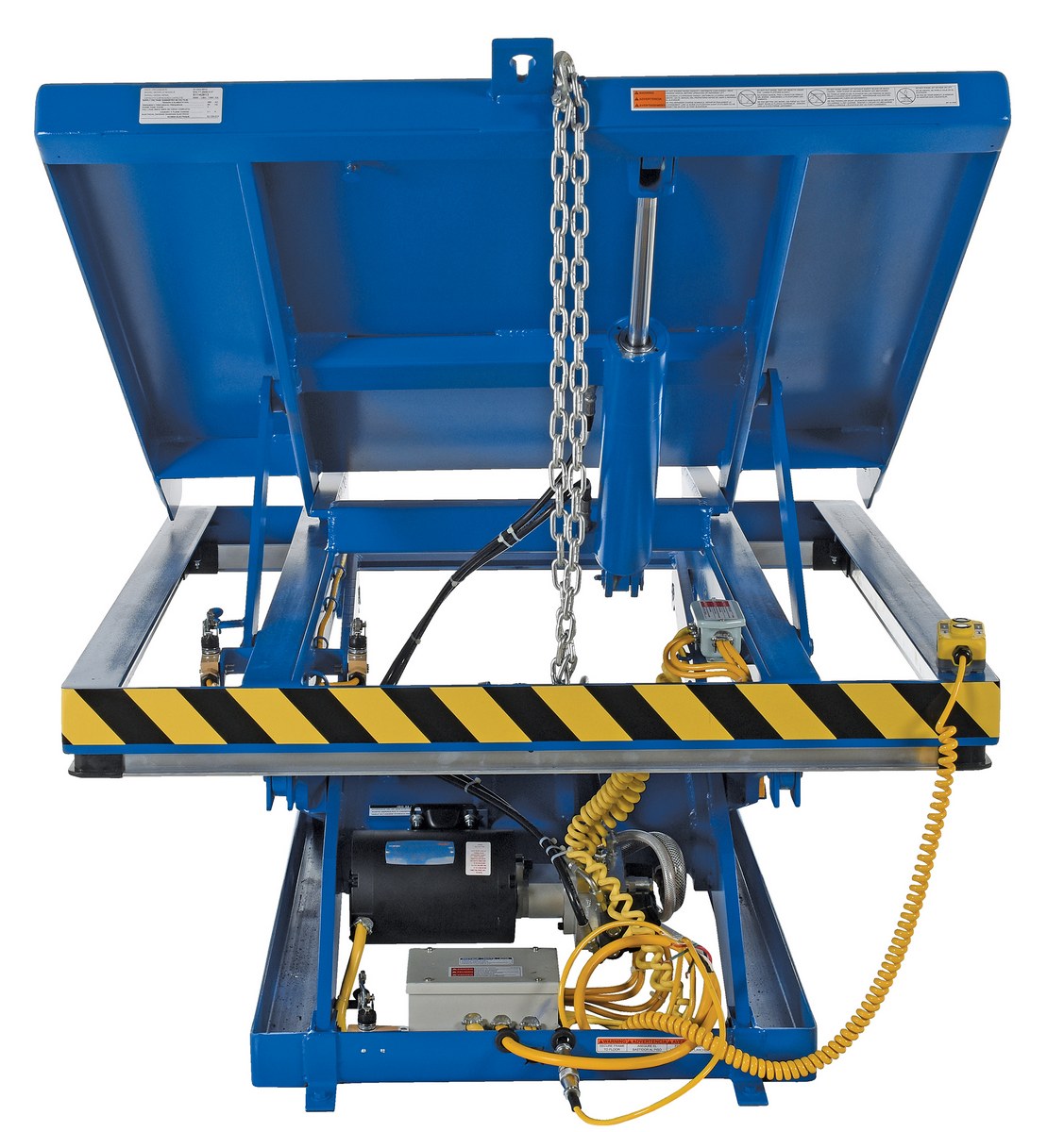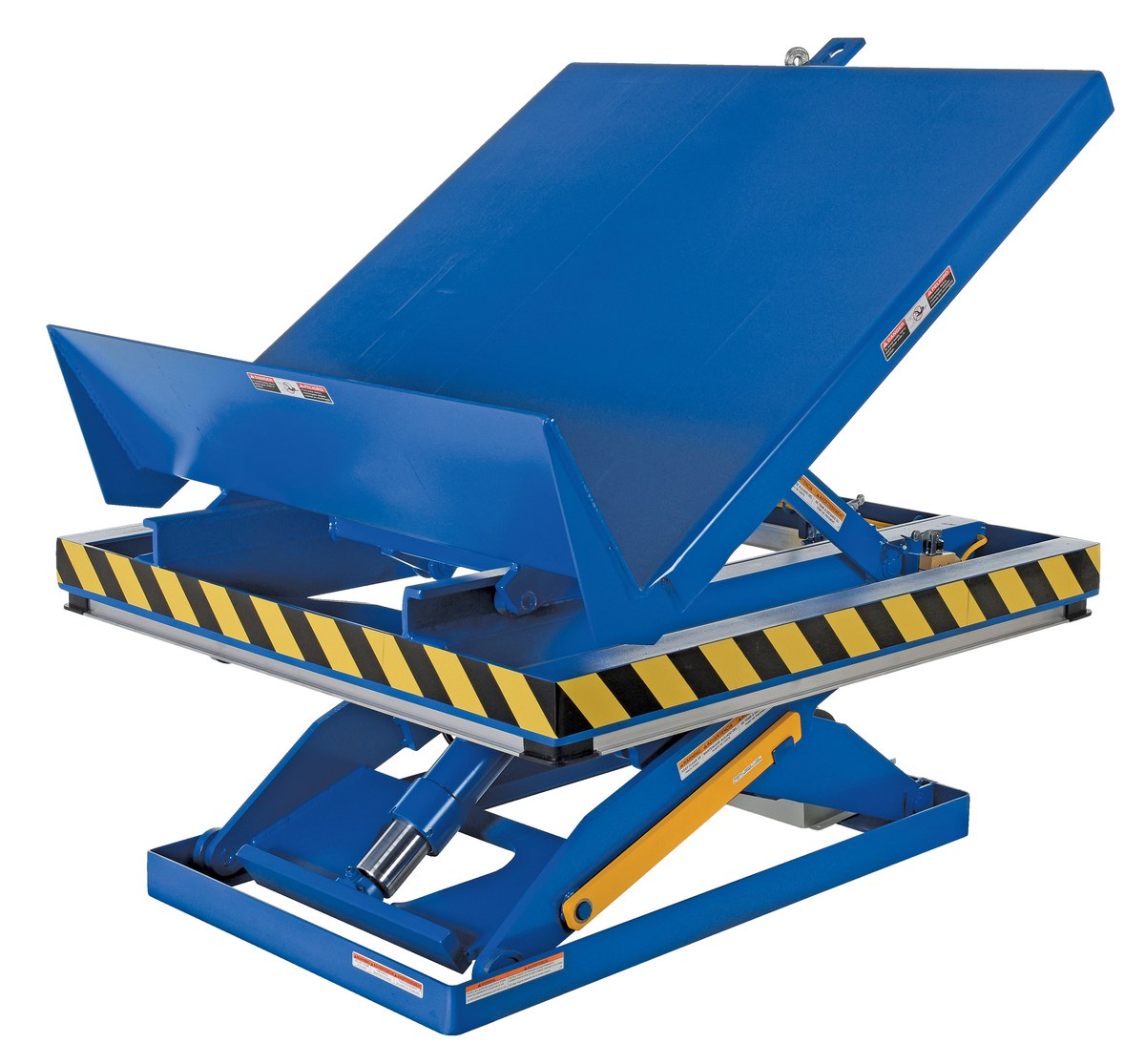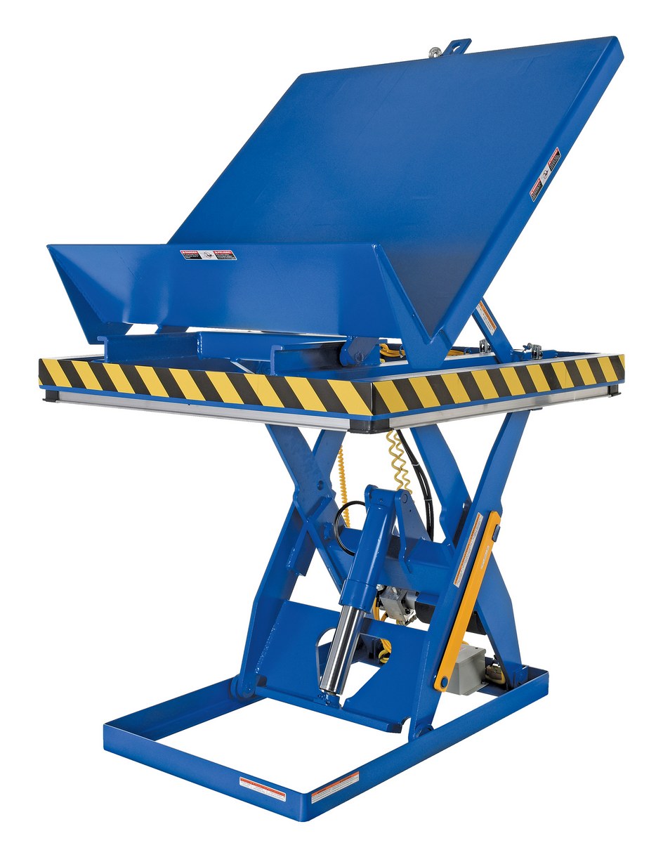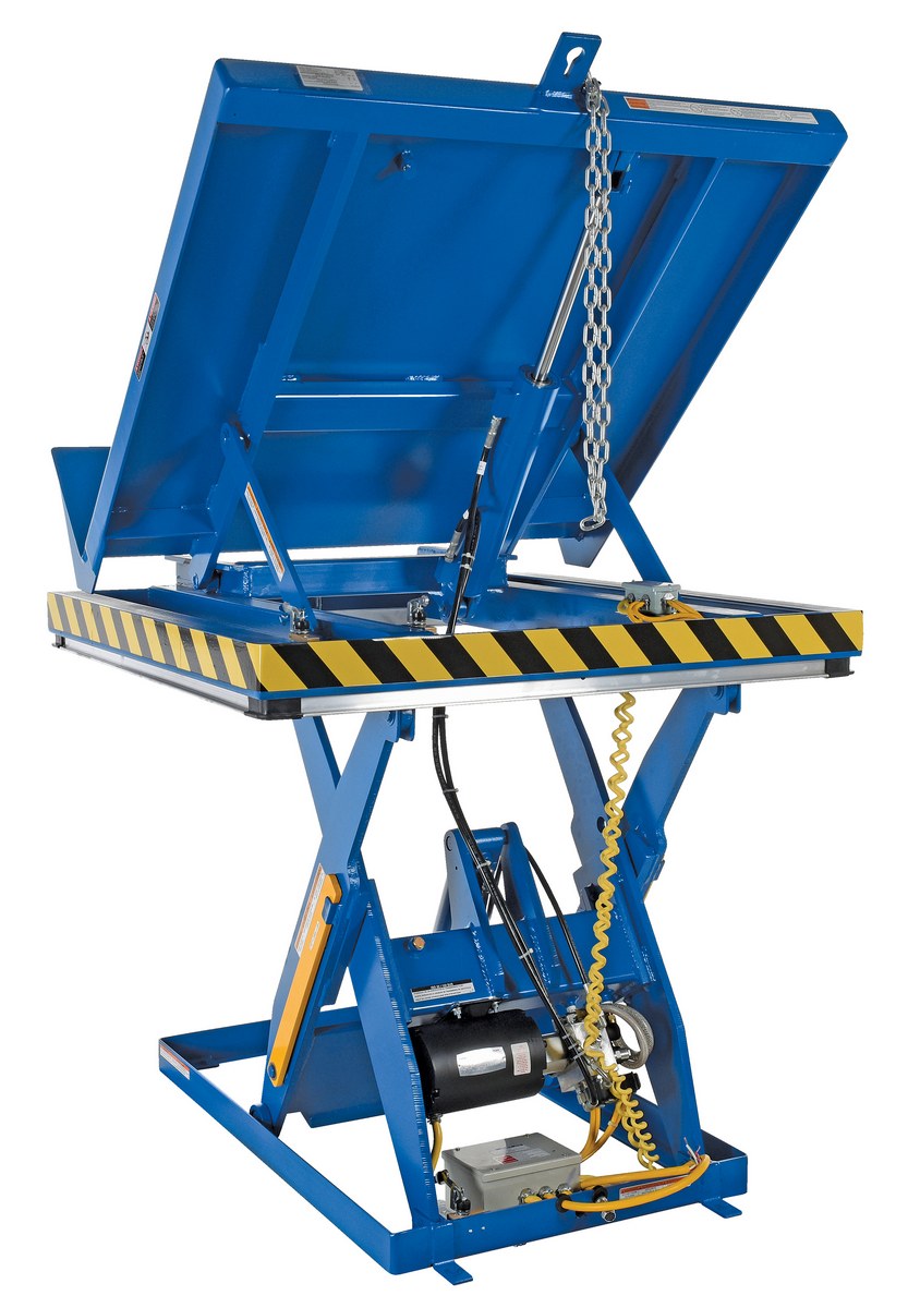 The lift and tilt scissor lift performs both lifting and tilting operations. There is a restraining chain and lip to keep the load in place during tilting. Safety features include an electric toe guard to protect workers from pinch points during lowering of the table, velocity fuses to hold platform position in the event of a hose or fitting failure, four (4) push-button hand pendent control, upper limit switch to stop travel at maximum height and reduce motor wear, and maintenance prop. The end tilt is standard with a side tilt available. There is optional accordion skirting available for both the lifting and tilting portions of the table.