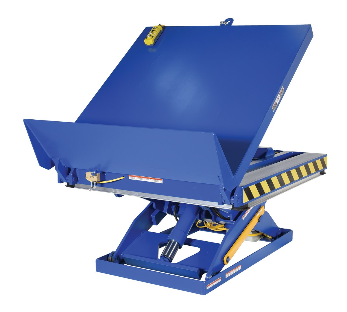 The lift and tilt scissor lift performs both lifting and tilting operations. There is a restraining chain and lip to keep the load in place during tilting. Safety features include an electric toe guard to protect workers from pinch points during lowering of table, velocity fuses to hold platform position in the event of a hose or fitting failure, four (4) push-button hand pendent control, upper limit switch to stop travel at maximum height and reduce motor wear, and maintenance prop. The end tilt is standard with a side tilt available. There is optional accordion skirting available for both the lifting and tilting portions of the table.