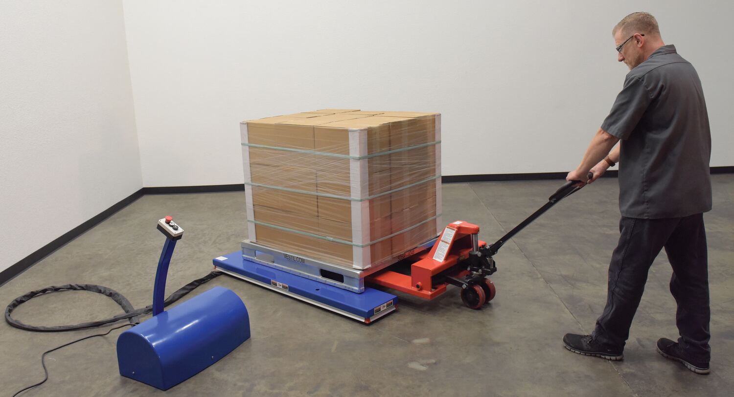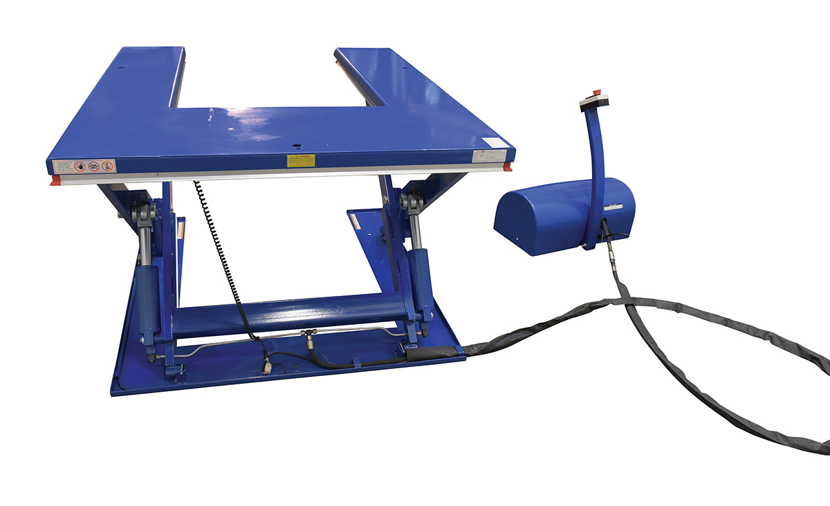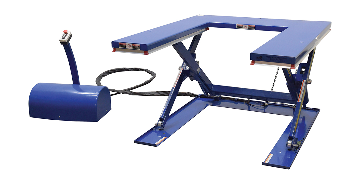 • Low profile "U" type electric lift table has an open center that enables a pallet truck to place a load on the platform