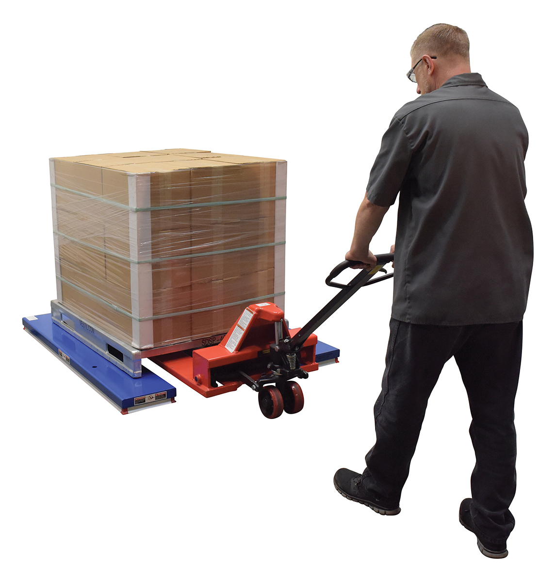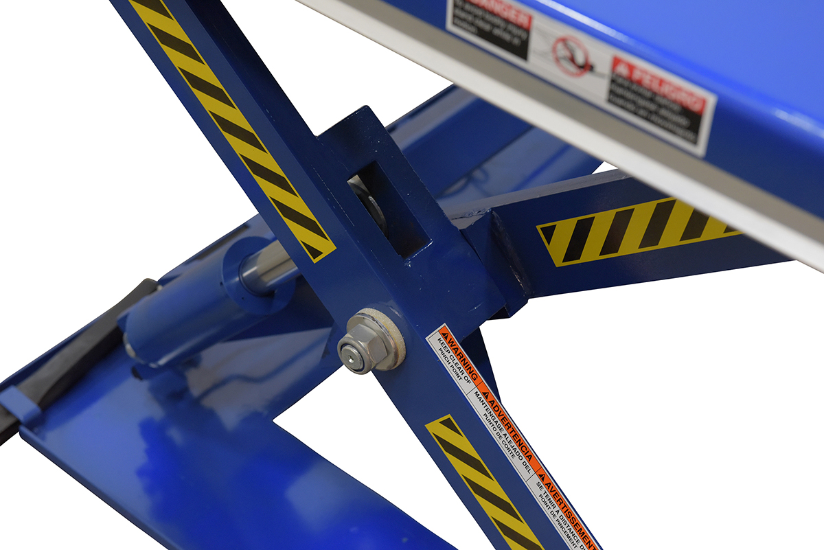 The low profile electric lift tables with the unique, steel constructed, "U" design provides an open center that enables a pallet truck to place a load on the platform. This lift table features an external power pack equipped with a pressure relief valve that prevents overloading and a flow control valve that controls the lowering speed. The remote power pack comes complete with a cover to protect the motor from dust and debris. The up and down push button raises and lowers the unit and is located on the control box. Safety features include toe guards, velocity fuse in cylinders, safety maintenance props, and an emergency stop button on the control box. The power supply has pedestal mounted push buttons. When using a pallet truck in conjunction with model, only open bottom pallets are to be used.