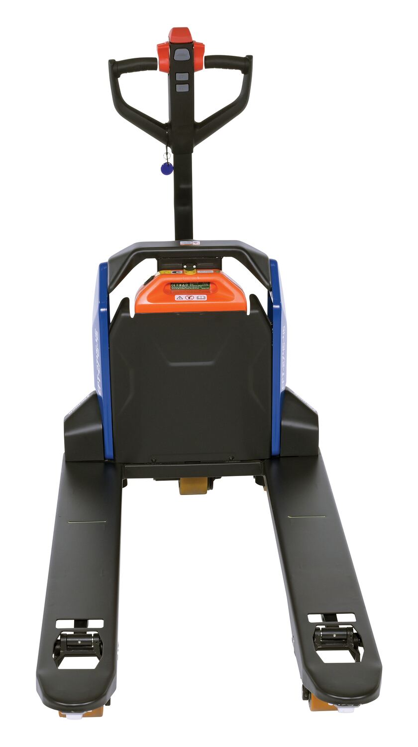 Steel Electric Pallet Truck 27 In x 45 In 4,500 Lb. Capacity Black/BlueAn electric pallet truck is the perfect upgrade from the standard manual design. This functional approach minimizes manual labor and maximizes efficiency when moving products and goods. Speed adjustments as well as raising/lowering forks can be modified without the users' hands leaving the functional handle. Unit is powered by a lithium ion battery for continuous consistent use. Forks are powder coated for a baked in added toughness. Horn is also included.