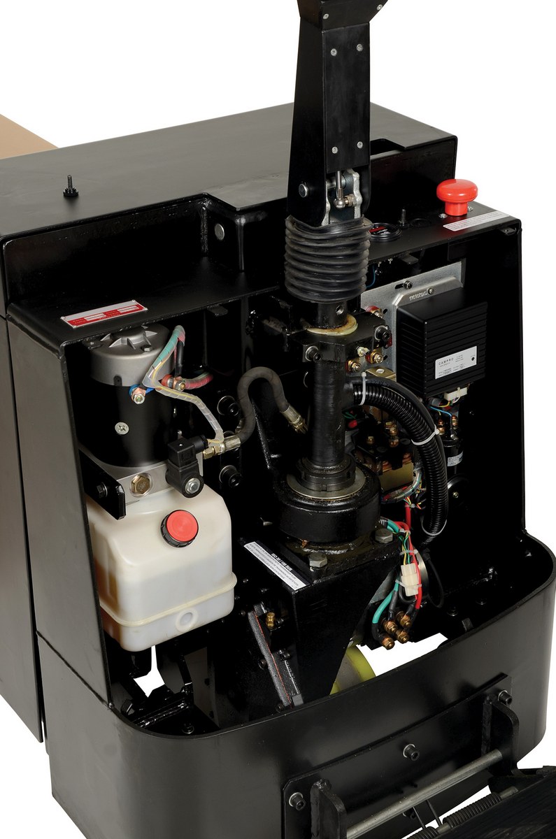 The fully powered electric pallet truck has an easy and quick operation. The unit raises and lowers loads with a push of a button. It can maneuver loads in warehouses and trailers. The reinforced welded forks have adjustable tie-rods that provide long service. The high-torque DC drive and lift motors handle heavy-duty jobs. Unit includes integral battery charger, battery level gauge, and emergency battery disconnect. The truck rolls smoothly on poly-on-steel, steer and load wheels. Ergonomic handle features easy to operate throttle with infinite adjustment of forward and reverse speeds, lift/lower controls, proprietary safety-enhancing emergency reverse function, and horn. When the proprietary safety-enhancing emergency reverse function is actuated, the emergency reverse belly switch instantly reverses direction and moves the unit forward (away from the operator) until the switch is released or after 1.5 seconds have elapsed. The built-in safety circuit will automatically disable the entire unit if the emergency reverse belly switch is activated for more than 1.5 seconds after which the unit must be re-set to return to normal operating conditions. This state-of-the-art safety device provides a high degree of operator protection. Includes an electromagnetic disc brake with automatic dead-man feature that activates when the user releases the handle. Also includes a stand-on platform, which flips up when not in use.