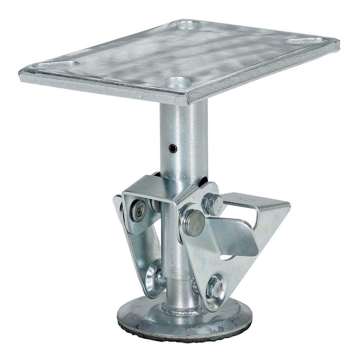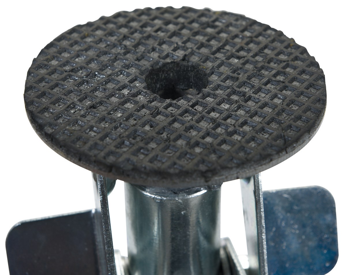 Floor locks may be used on platform trucks, fixture dollies, or equipment with casters. Simple foot pressure immobilizes equipment. Locks when large friction face is pressed against the floor. To release simply kick release rod. Brake is independent of casters and can be installed to any convenient location on the cart. Vertical mounting plate designed to mount to sides of carts and other portable products. The spring loaded pad accommodates uneven floors. Units mount with pad 1." off the floor when retracted.