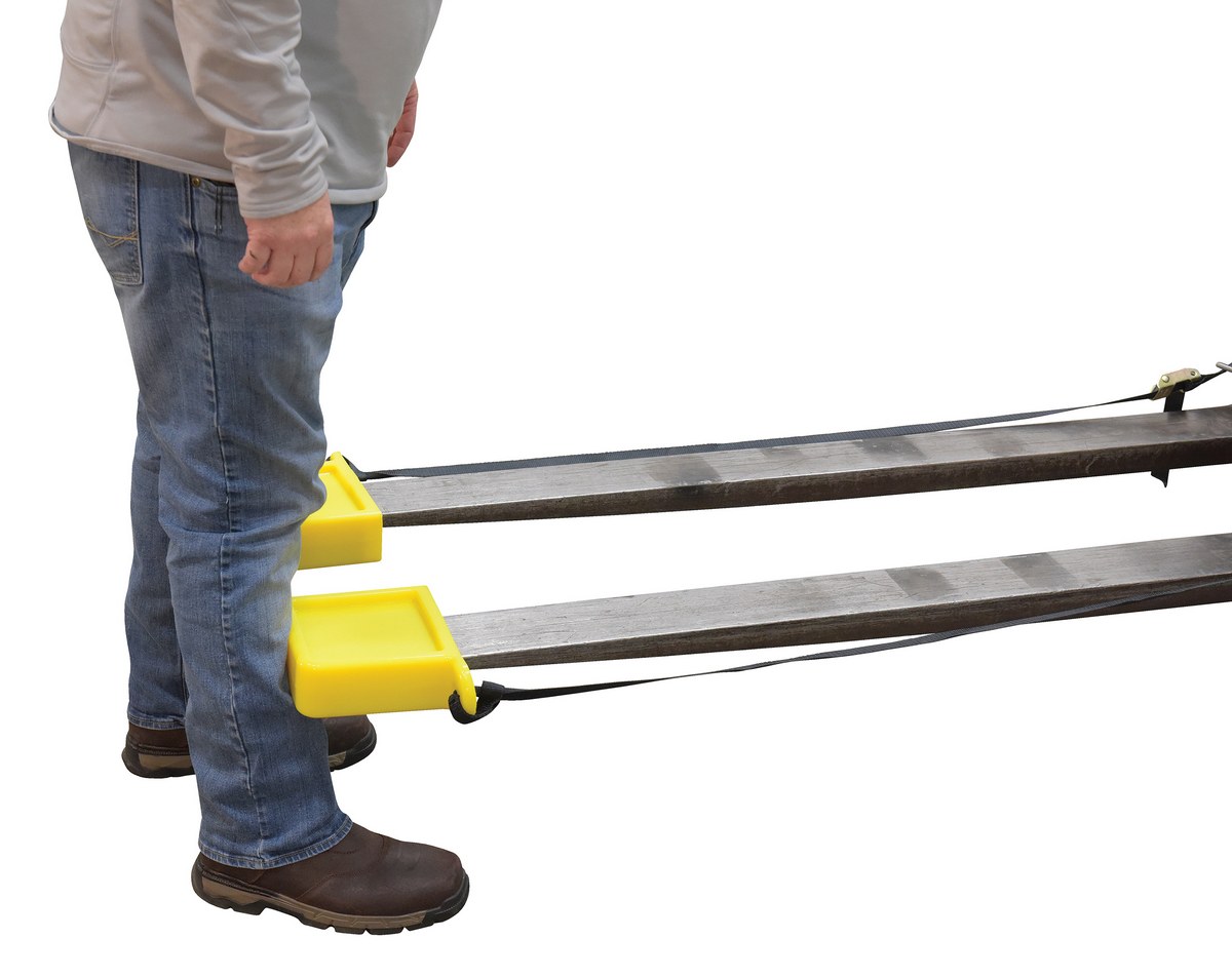 The fork tip protector is a quick and easy way to make forks safer in a variety of work environments. A durable construction is lightweight and compact for simple storage when not in use. The included nylon strap allows the user to secure the protector in place, for limited jostling during movement. Units are available in a thick and thin outer shell design. Fork tip protectors are sold in pairs.