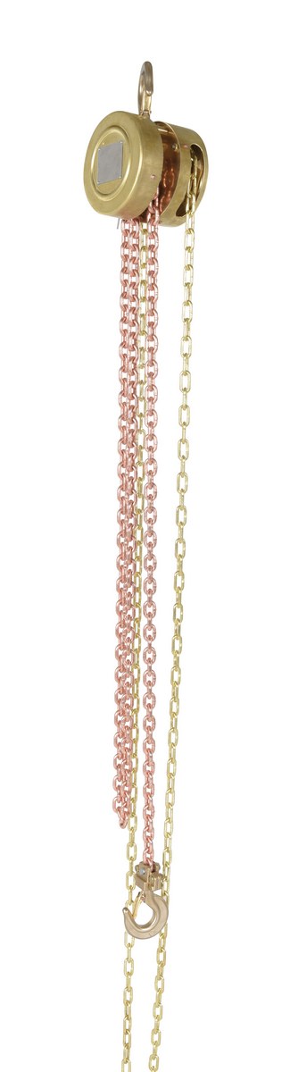 Non-sparking brass construction. Brake engages automatically as soon as the hand chain stops moving. Forged load hooks. Low gear ratio reduces effort required for lifting. Satisfies relevant ANSI B30.16-2003 requirements.