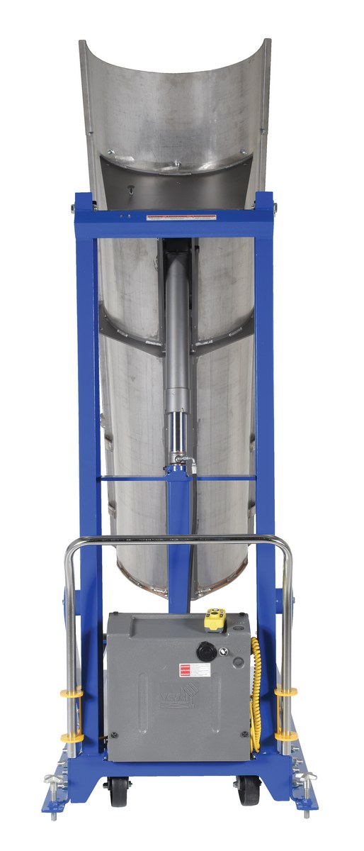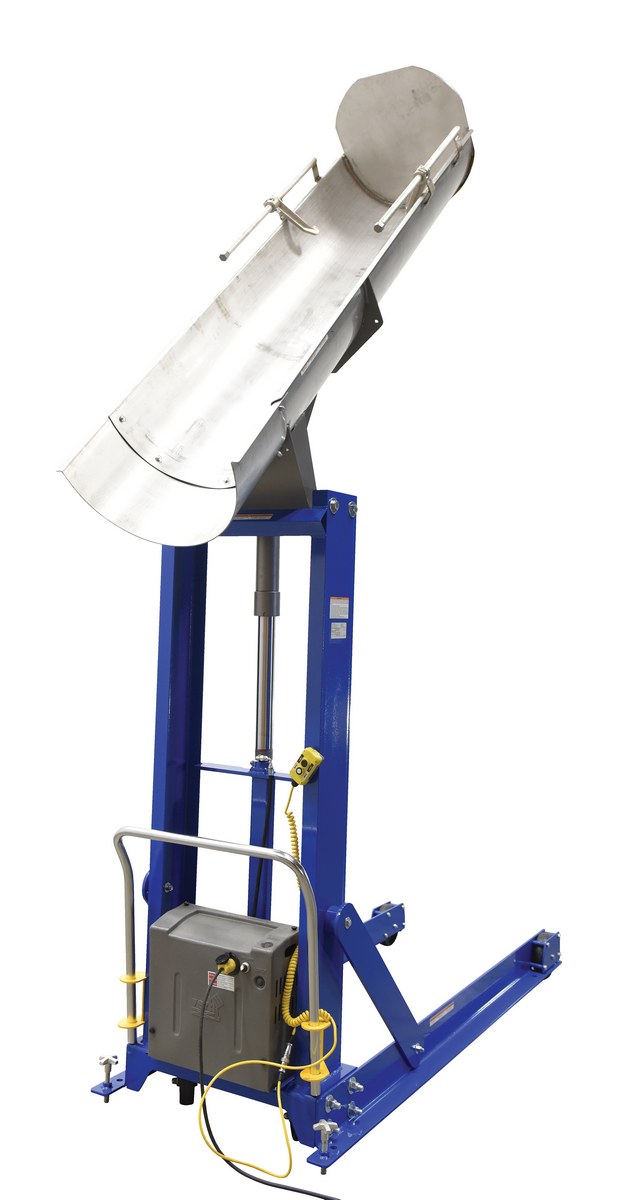 Stainless Steel Portable Hydraulic Drum Dumper 72 In. Dump Height 750 Lb. Capacity Blue/SilverThe Hydraulic drum dumper is what you need to dump heavy drums. Works with plastic, steel, and fiber drums. Dumper has a solid steel chute. this portable unit has casters with floor lock screws. All steel construction. Upper travel limit switch, emergency brass safety velocity fuse in cylinder, and vertical adjustment drum restraints are standard. Dumper is operated with a hand held control on a coil cord standard.