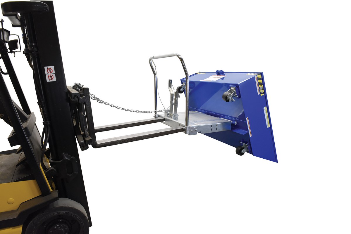 This unique Low Profile parts Hopper has been designed to function as a parts hopper that may be dumped with the assistance of a fork truck. The low profile design allows the hopper to be placed underneath machinery as a catch basin for parts. The newly designed hopper reduces the hazards, inconveniences, and time associated with collecting parts off the floor. Unit rolls smoothly on casters and includes a removable push handle. Once the material is dumped, the hopper will return to the locked position when lowered to the ground. The included safety restraint should be properly secured to a fork truck before dumping.