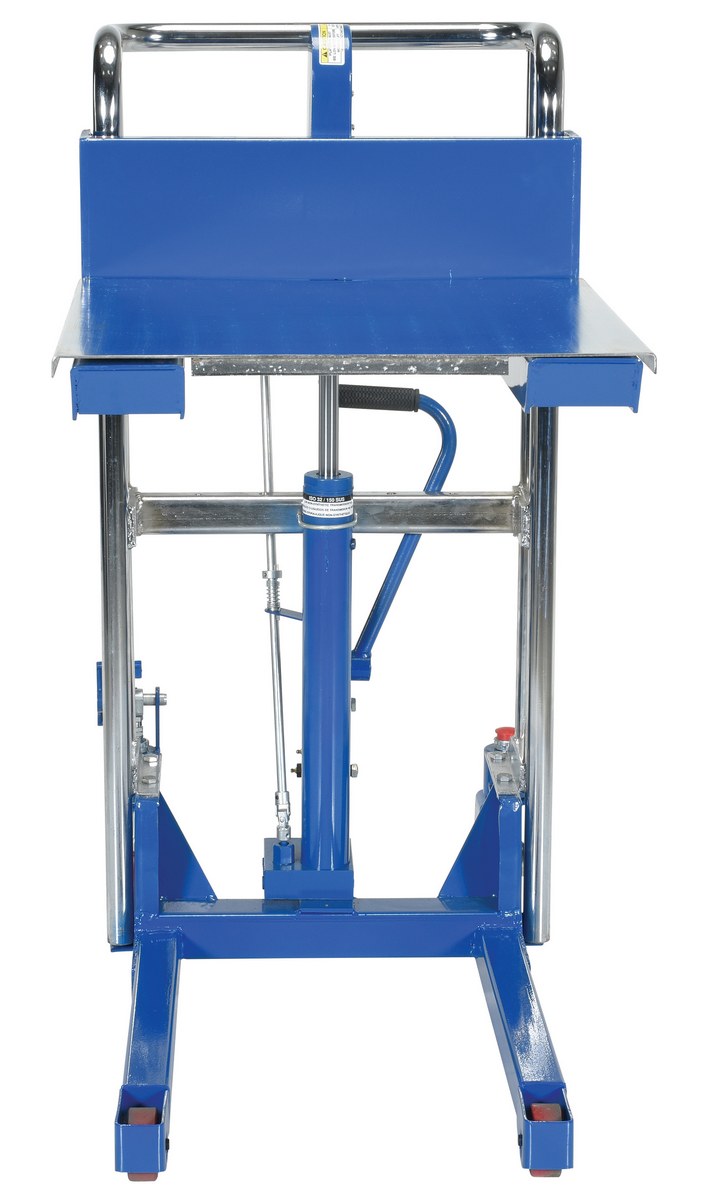 Steel Portable Welded Hydraulic Hefti-Lift 880 Lb. Capacity BlueThe Hefti-Lift units provide reliable powerful lifting when moving and positioning loads. The manual hydraulic foot pump yields 1" of platform travel per stroke. The units roll smoothly on two rigid and two swivel poly-on-steel casters with foot operated brake. The units are designed of welded steel construction with chrome platform uprights. Each fork is 4."W x 2."H, the fork length is the same as the platform length. Overall fork width is 22". Not for use with pallets.