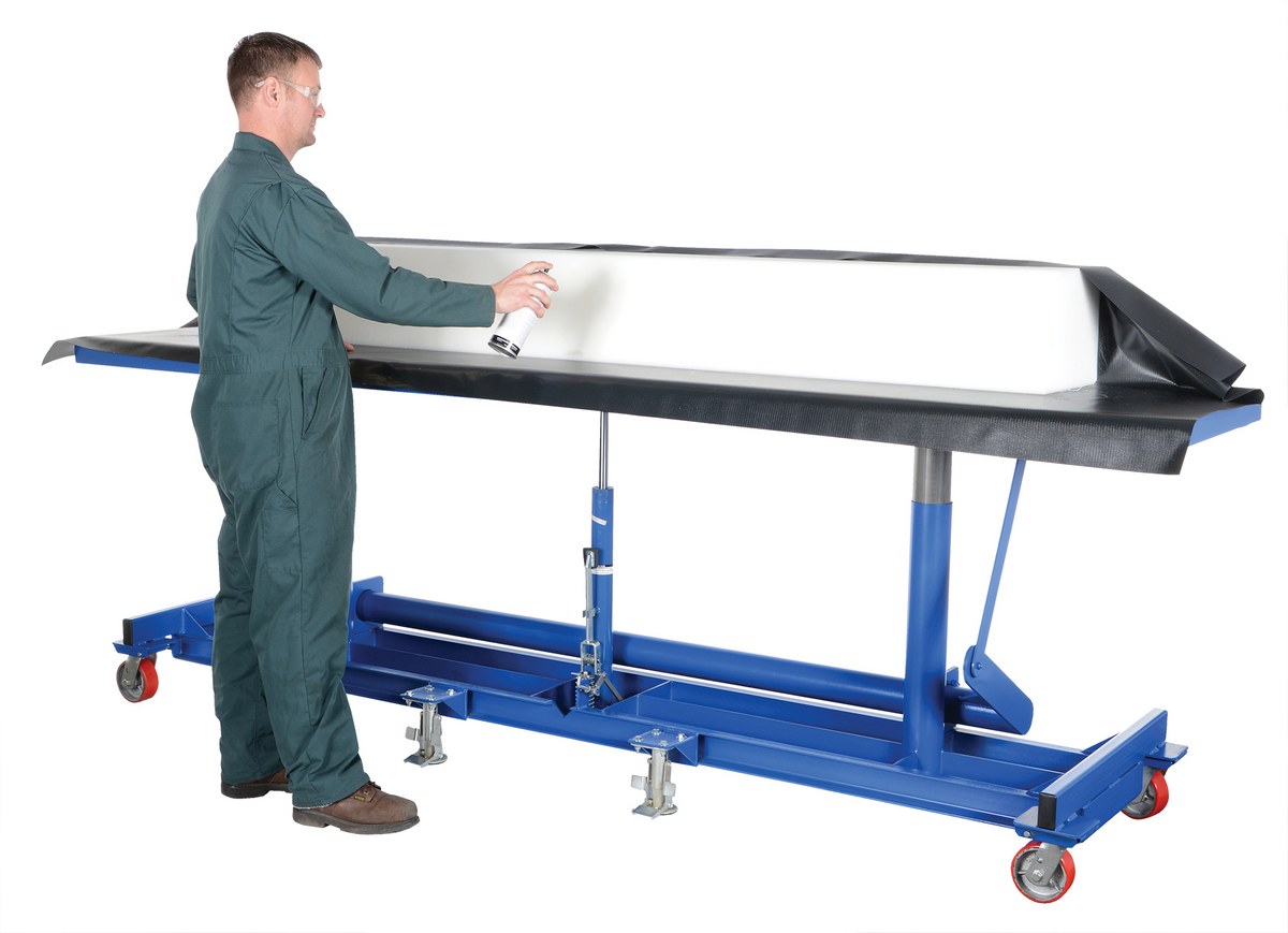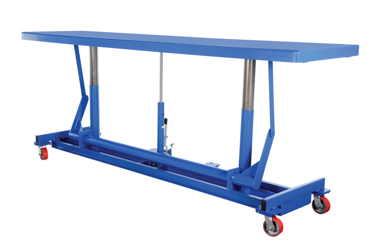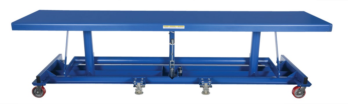 The long deck cart is perfect for sheet and strip handling as well as ergonomic load positioning. The platform height is adjusted with manual hydraulic foot pump. Unit comes standard with four (4) swivel poly-on-steel casters and dual floor locks.
