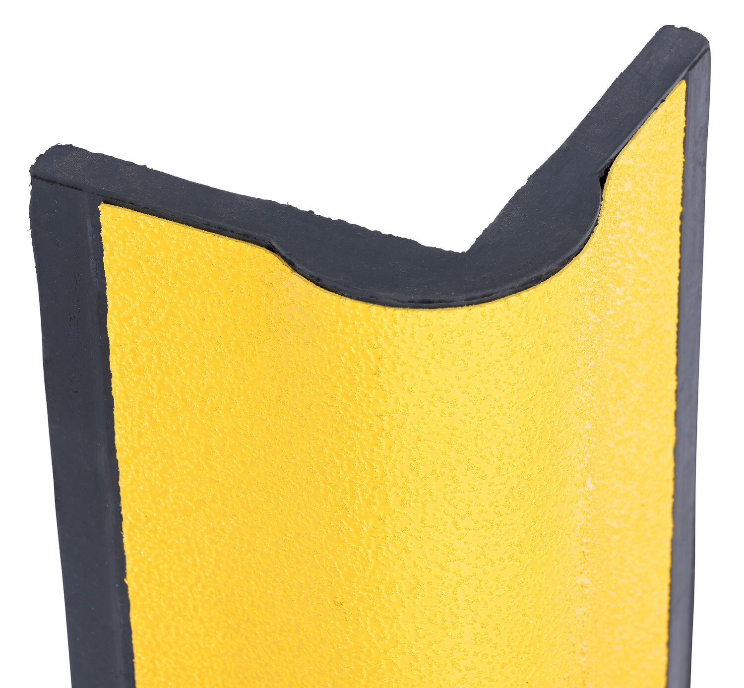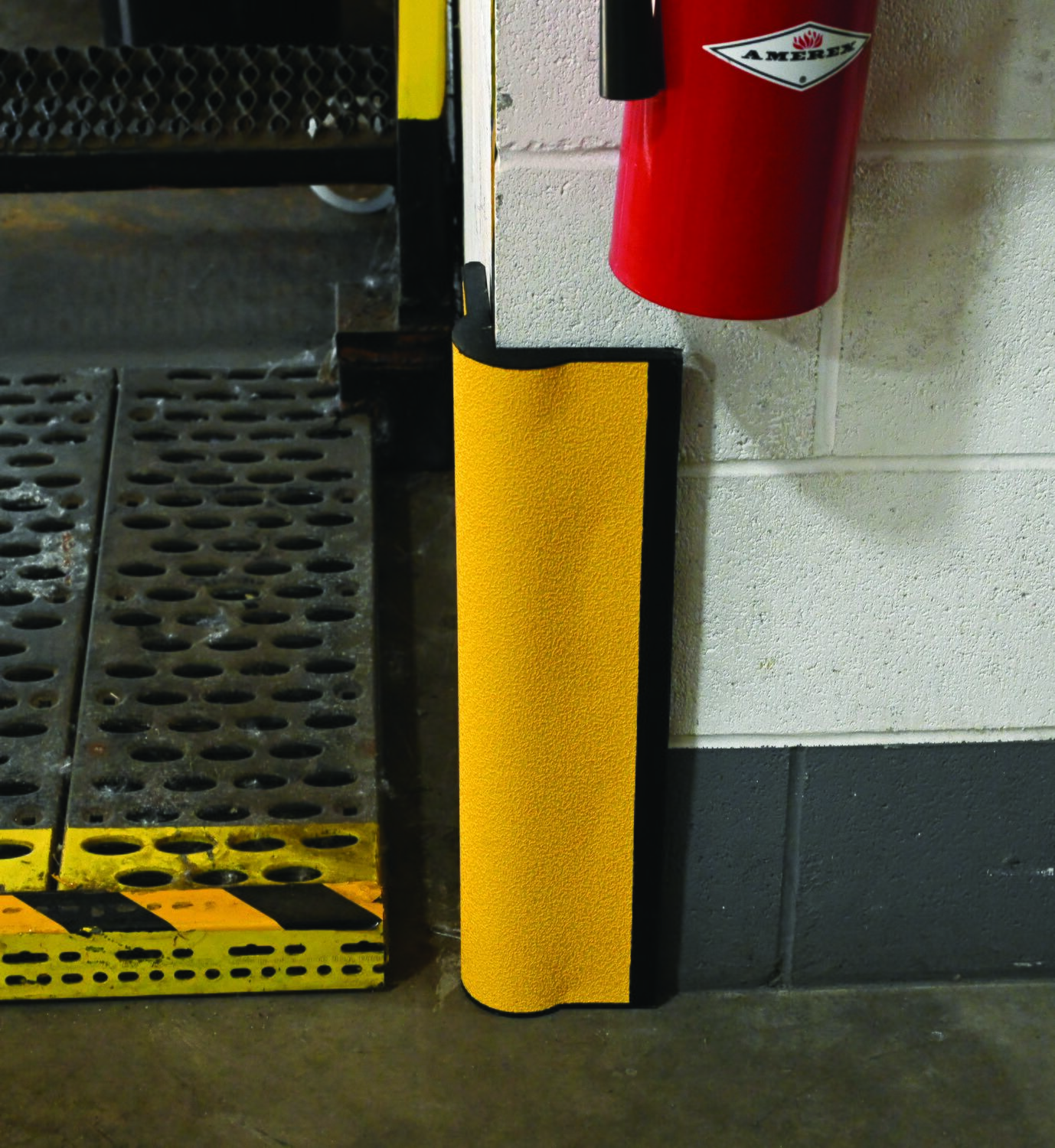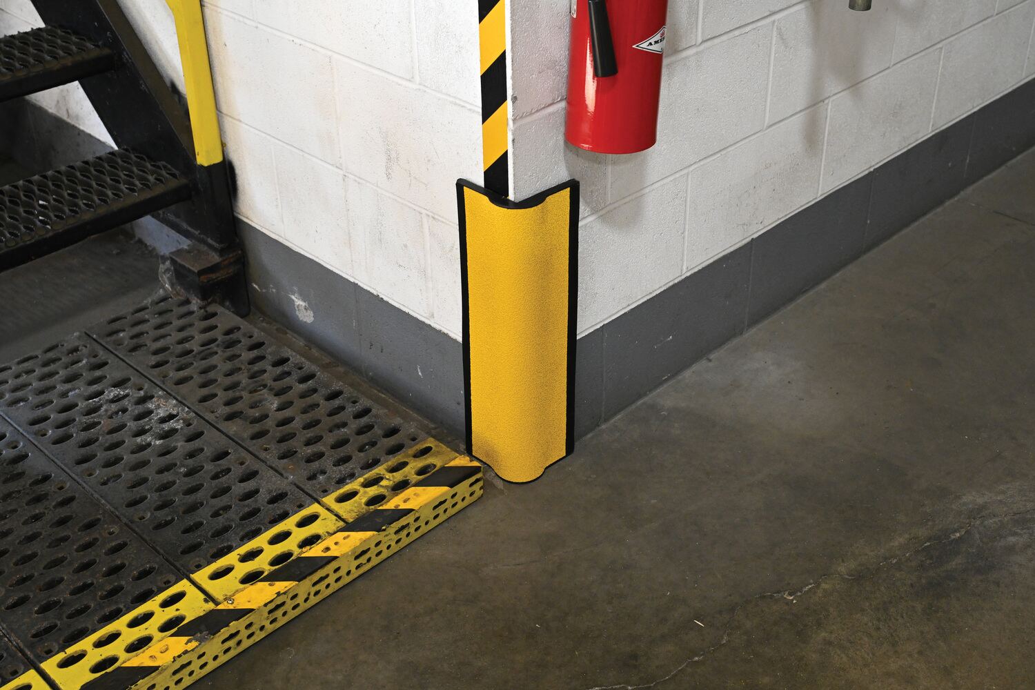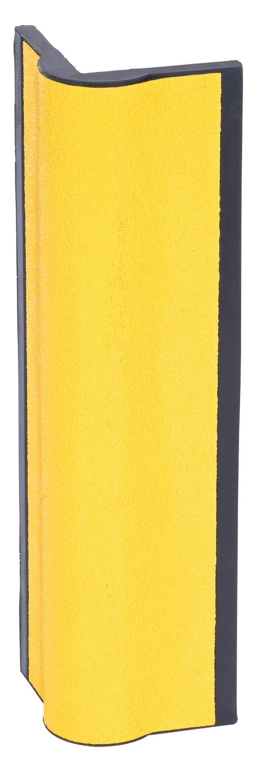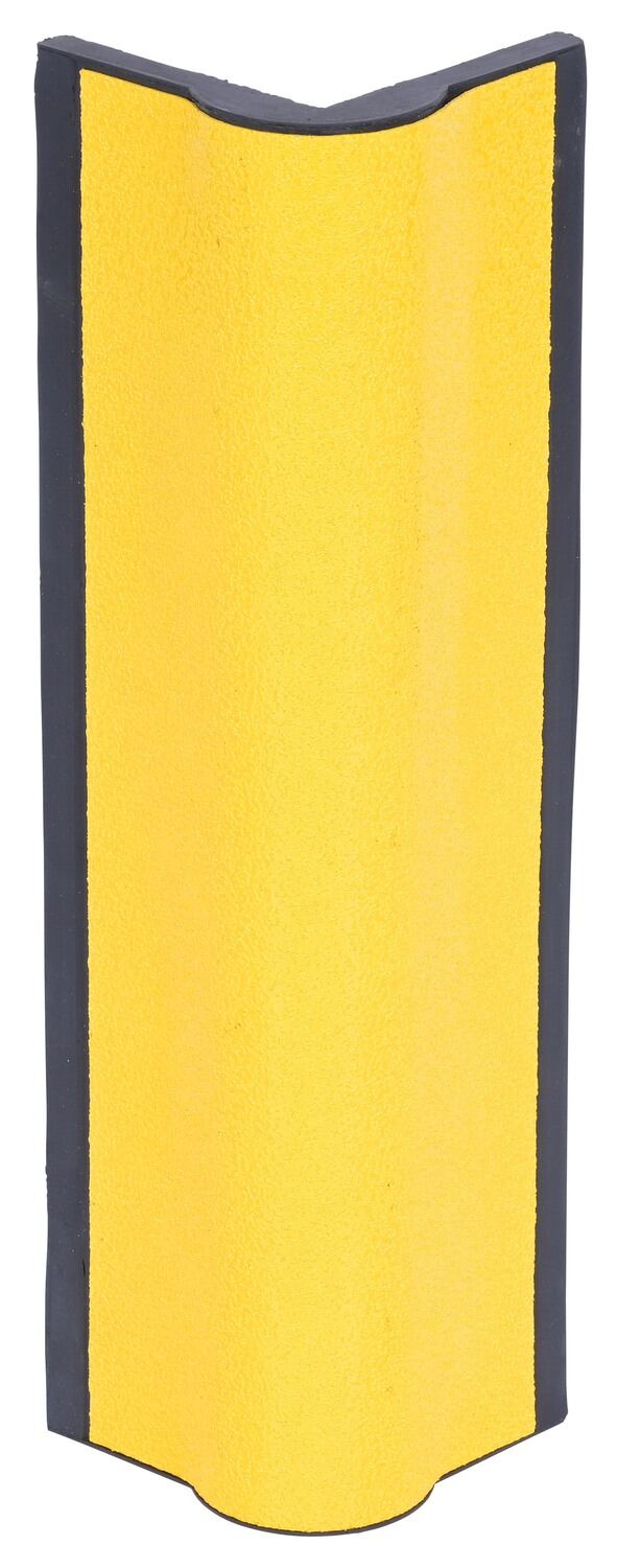 This heavy-duty corner protector is designed to protect corners from damage. Extremely versatile protection for in warehouses, offices, overhead door frames and tracks, or any ninety (90) degree corner. Made from black molded rubber. This corner protector includes reflective safety yellow tape for higher visibility. No pre-drilled holes.