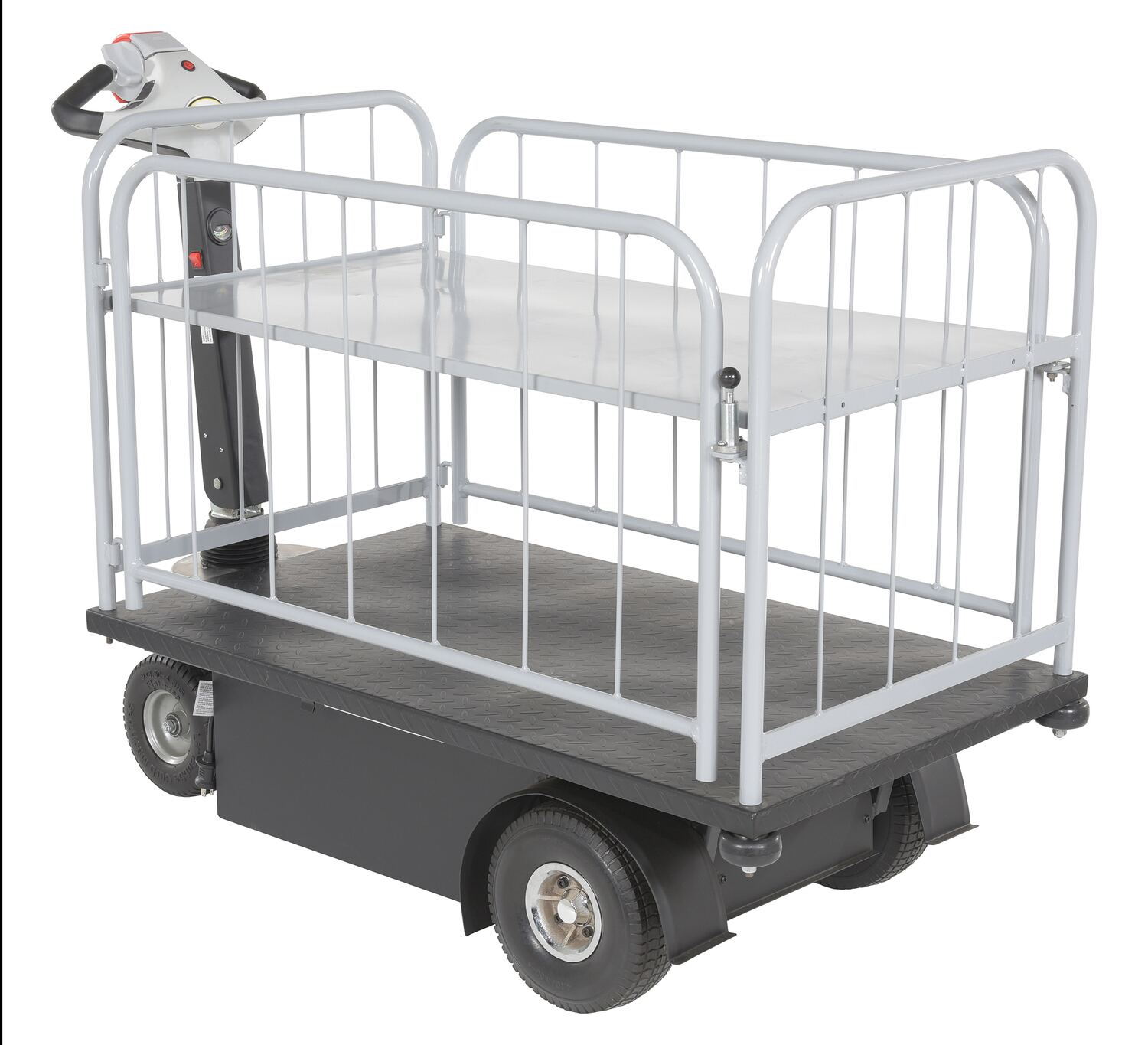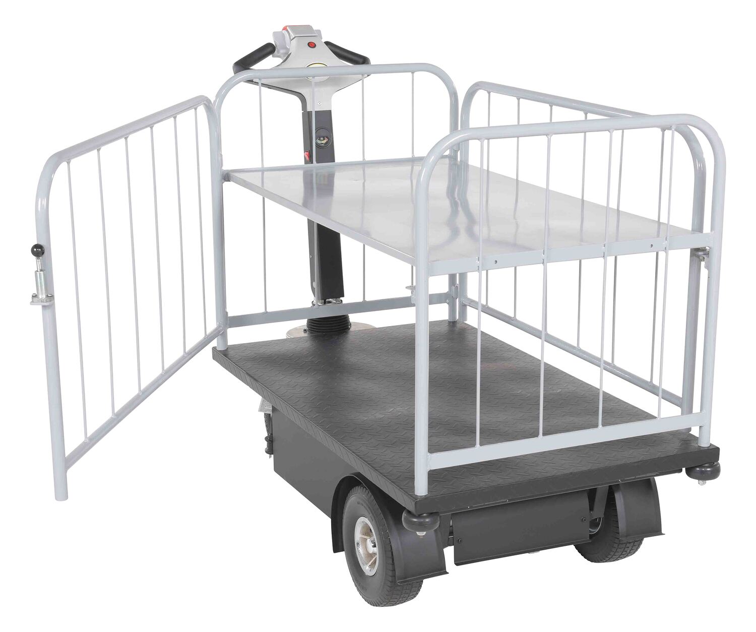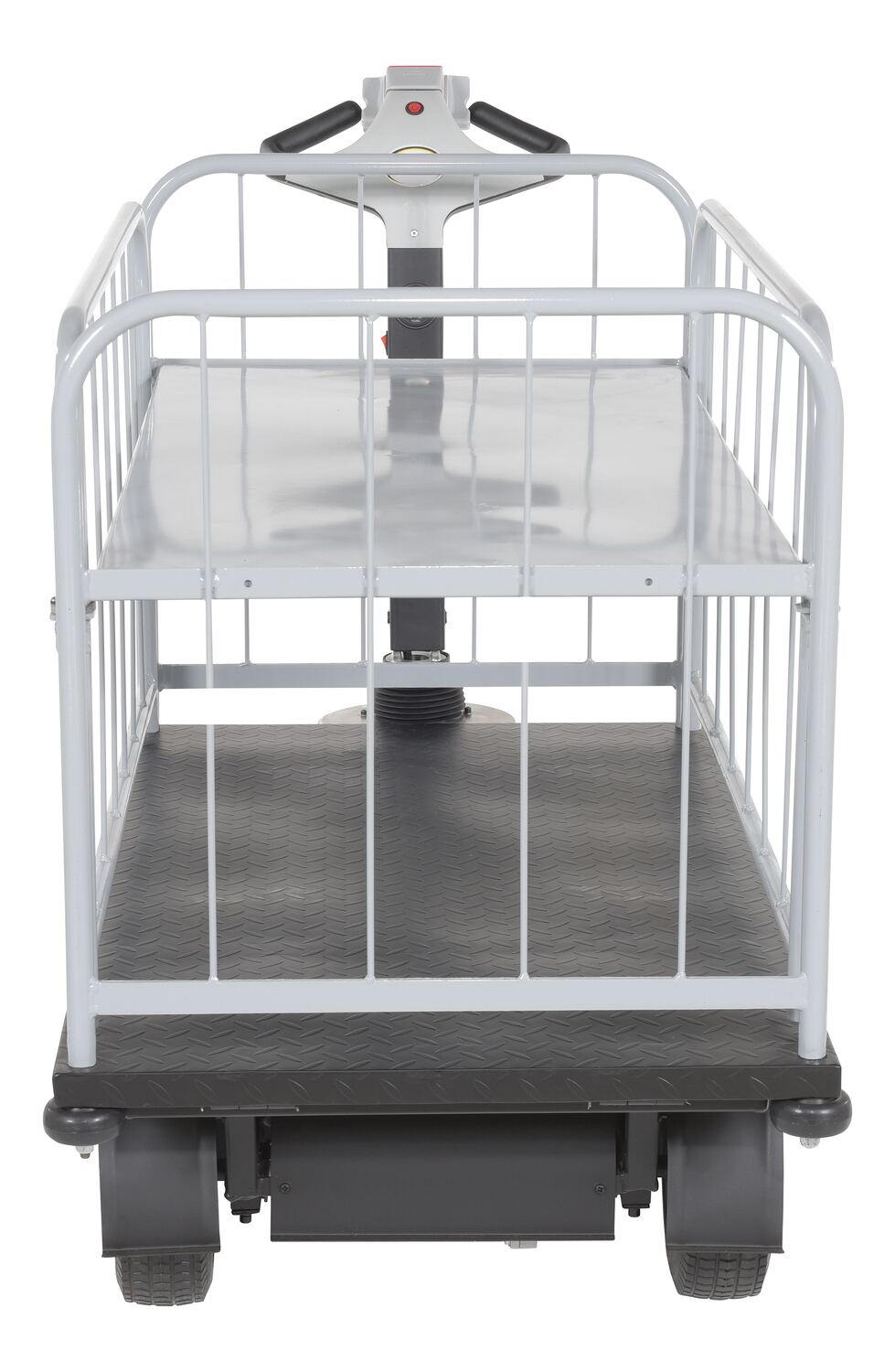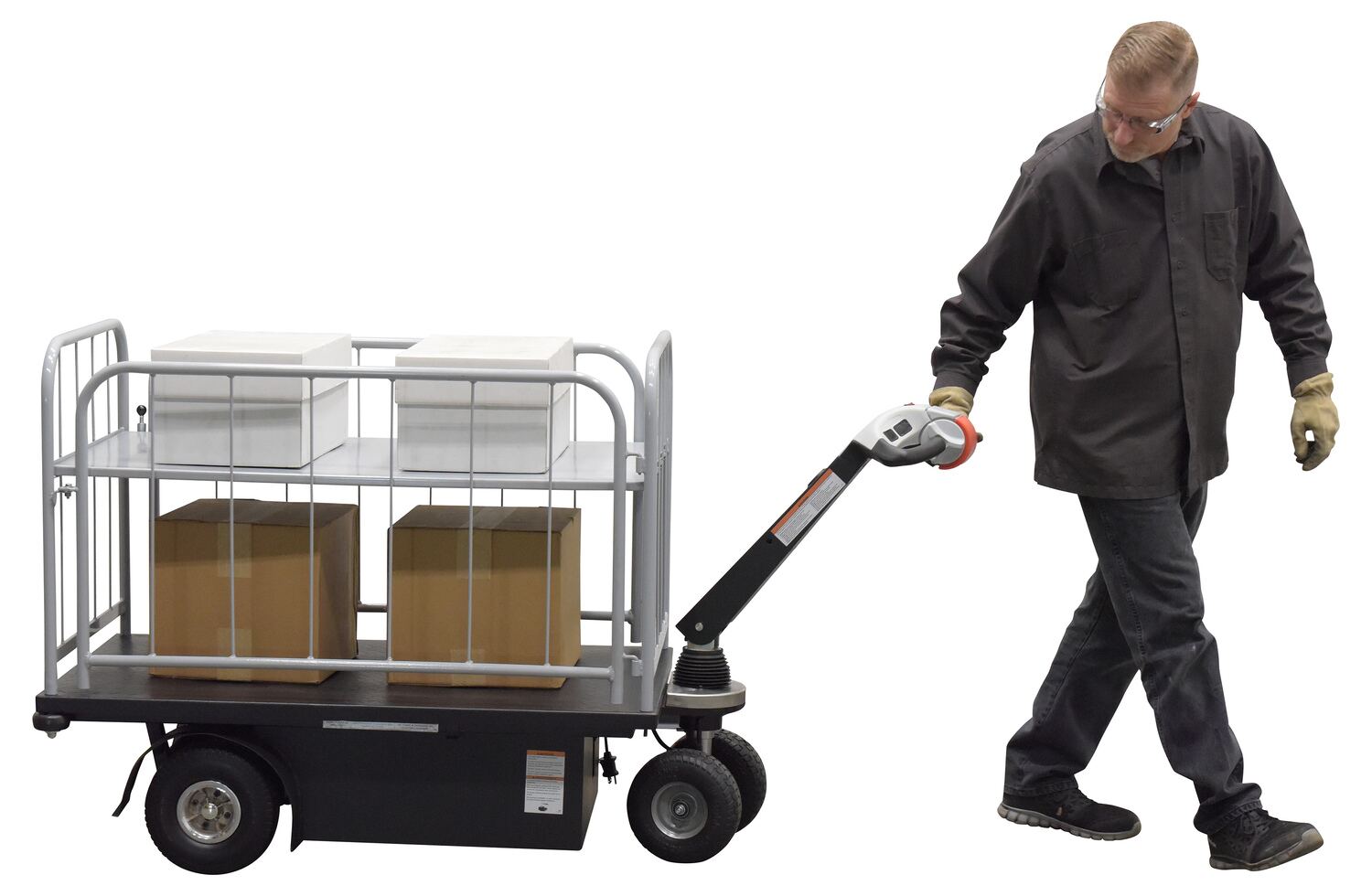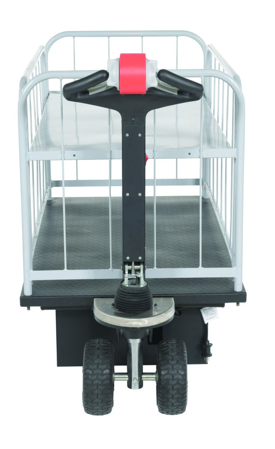 This traction-drive cart features built-in traction-drive system for easy transportability. Ideal for applications including mail rooms, hospitals, supermarkets, hotels and warehouses. Features electric drive motor with batteries for power. Internal battery charger is included. Variable throttle speed control for precise maneuvering and positioning is located in the handle. Speed control is conveniently located in handle. Handle pivots back towards operator and includes horn, automatic brake and emergency stop. Each shelf includes a non-slip tread plate surface. Includes on-board charger and battery level indicator.