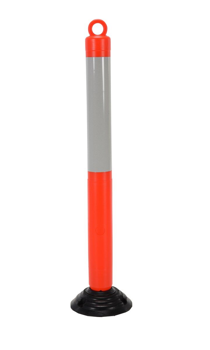 Plastic bollards are engineered for safety and the reduction of accidents. A fluorescent orange color scheme with white reflective tape promotes safety and visibility. A loop located at the top of the unit enables easy handling and is ideal for any workplace. Spring loaded for forgiveness when contact by an outside force. Base has 3 holes for mounting to surface. Hardware for mounting base is not included.