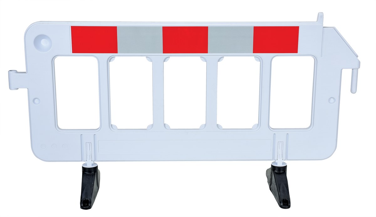 Portable barriers with removable base feet. Manufactured from virgin HDPE material and includes UV stabilizers for longer life. Reflective tape provides better identification at night. The black recycled rubber base feet are weighted for stability.