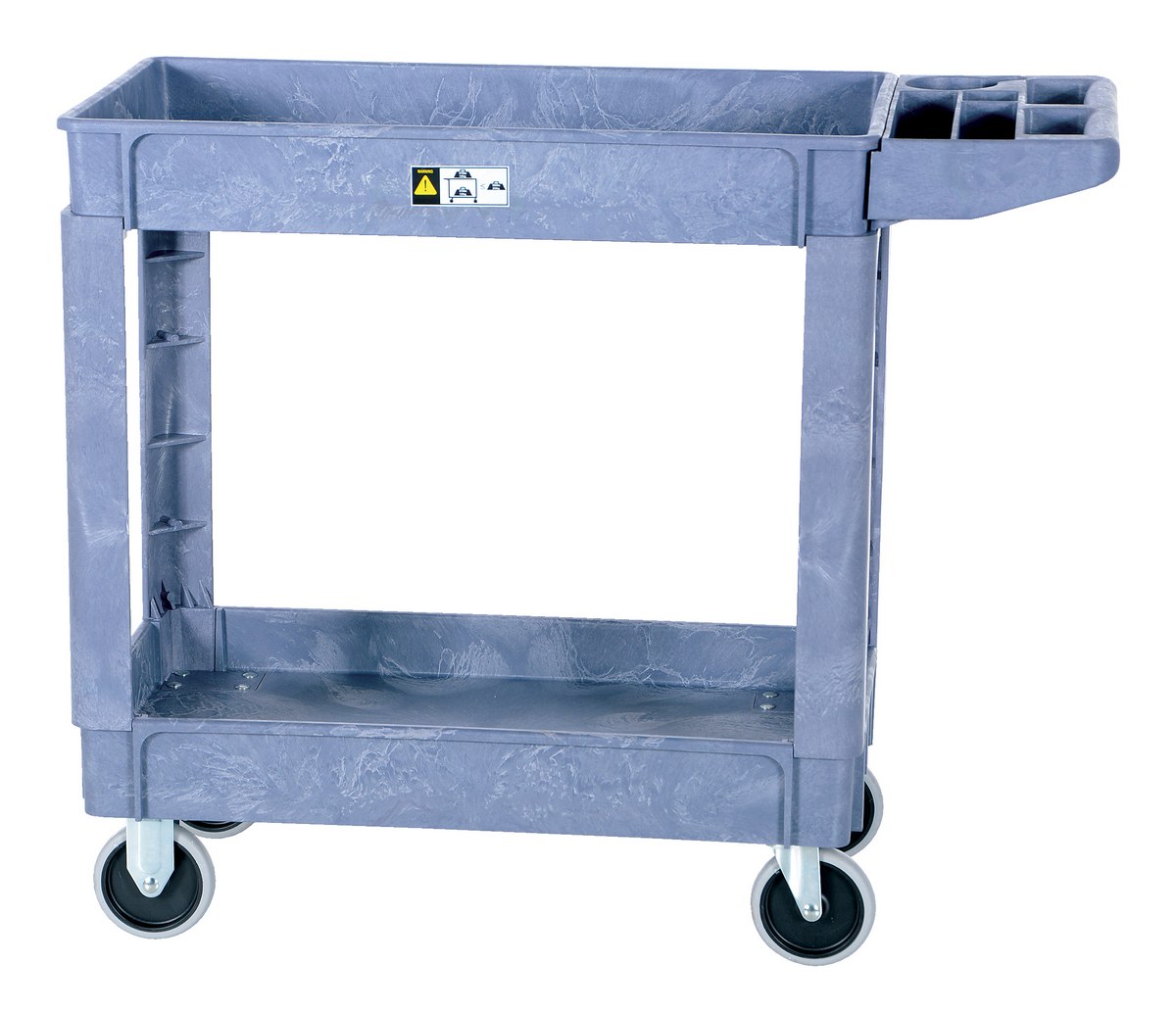 This plastic utility service cart is constructed from durable yet lightweight structural foam plastic. Choose the two (2) shelf design to accommodate your application. Deep lips prevent parts from rolling off. Ideal for mail rooms, shipping docks, grocery stores, warehouses, and inventory rooms.