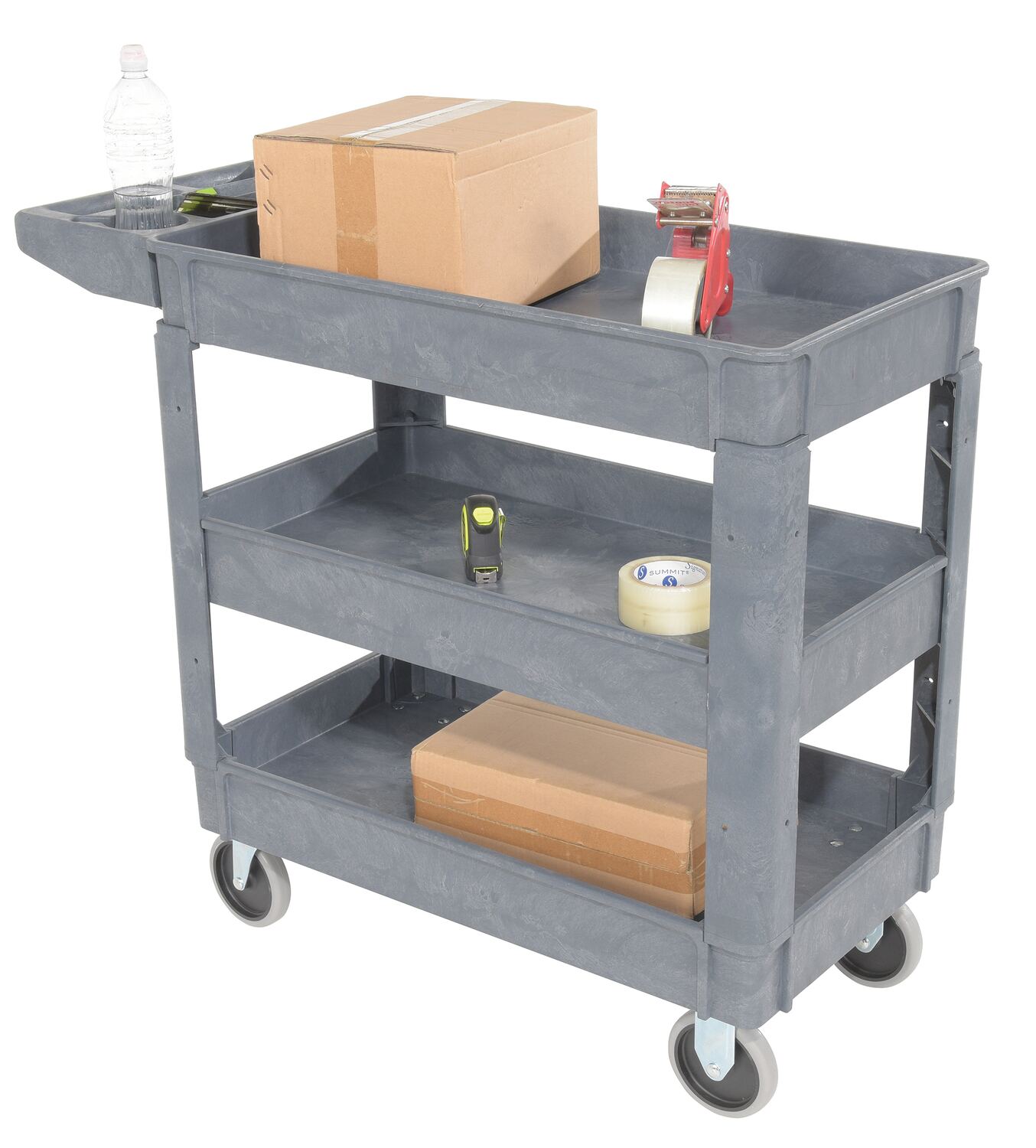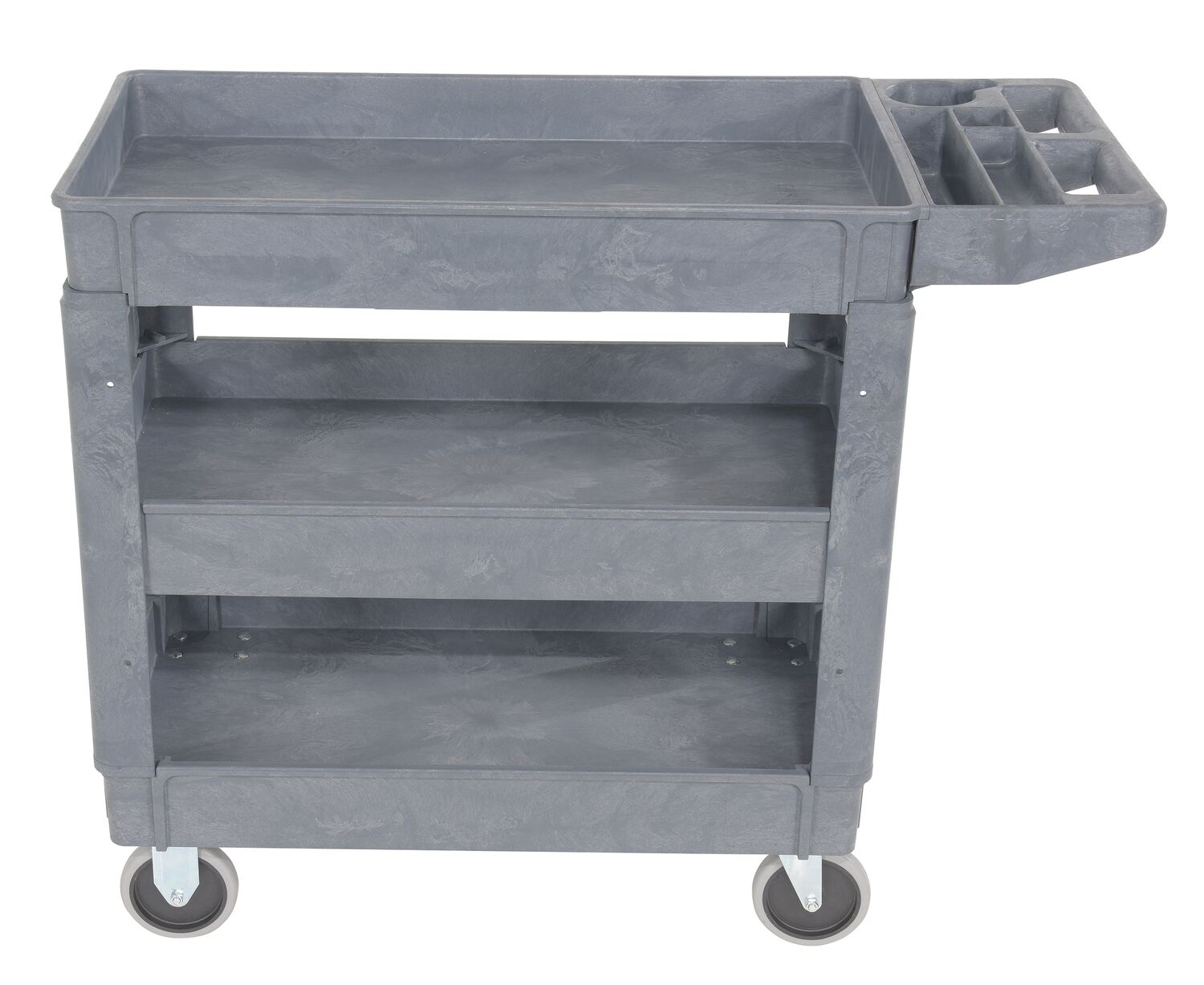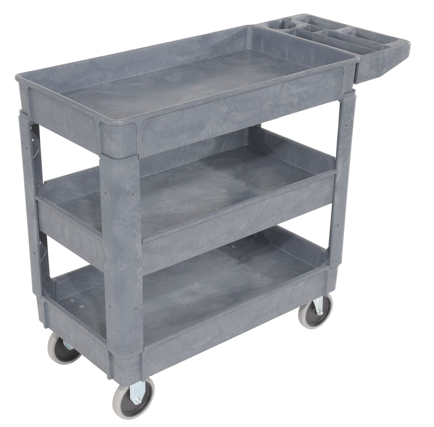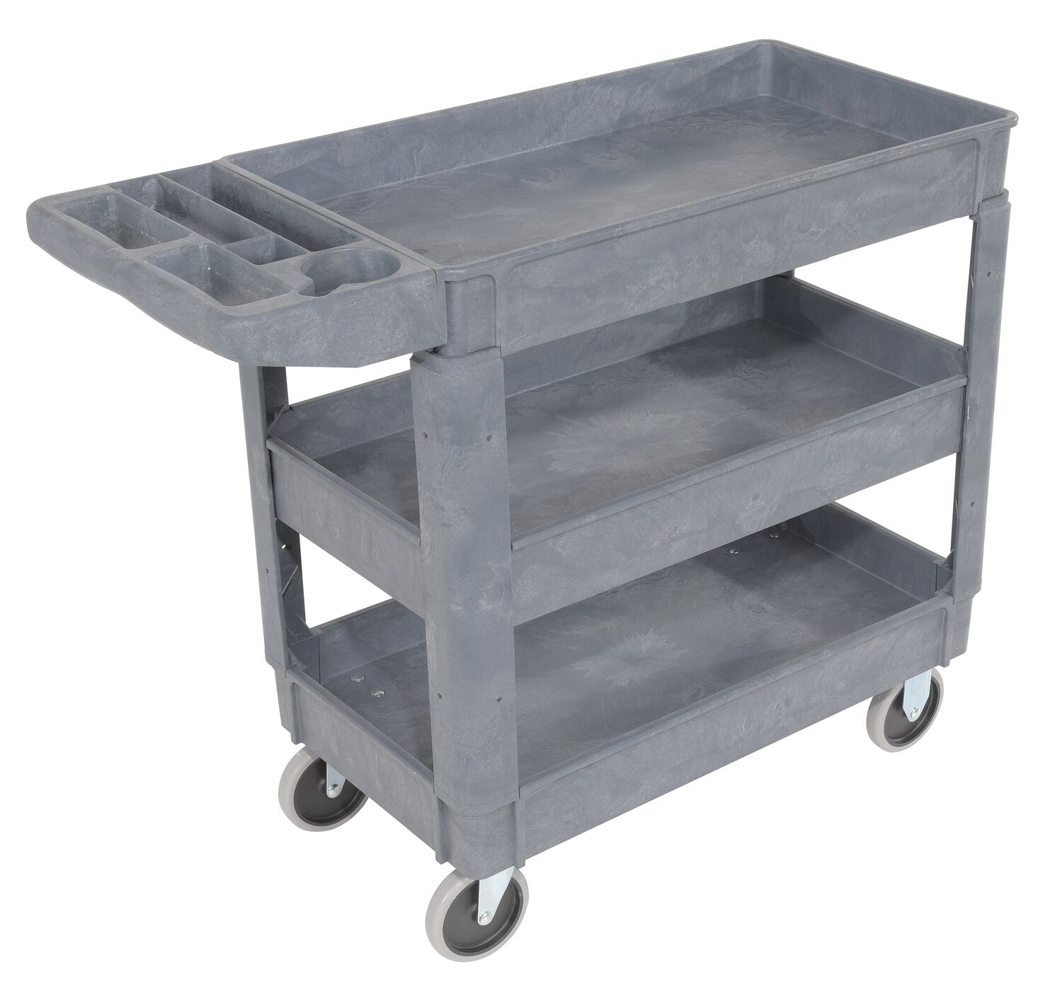 This plastic utility service cart is constructed from durable yet lightweight structural foam plastic. Choose the three (3) shelf design to accommodate your application. Deep lips prevent parts from rolling off. Ideal for mail rooms, shipping docks, grocery stores, warehouses, and inventory rooms.