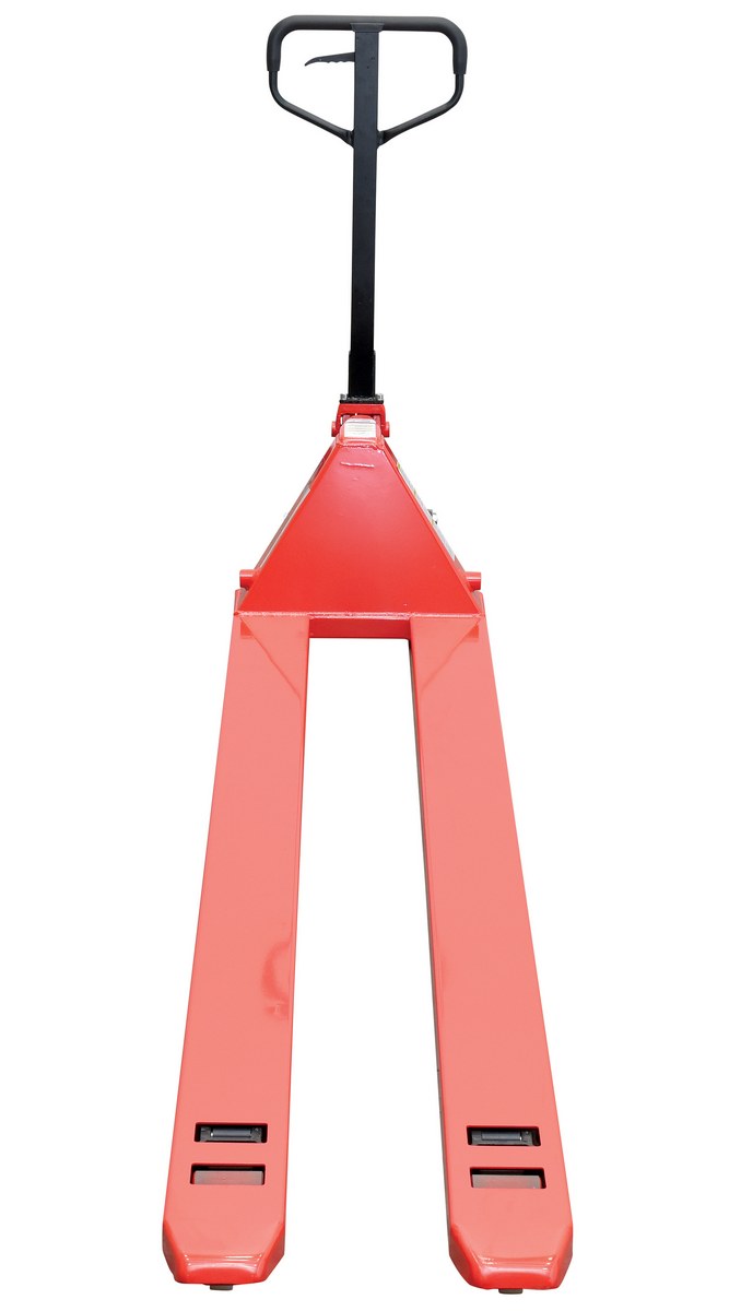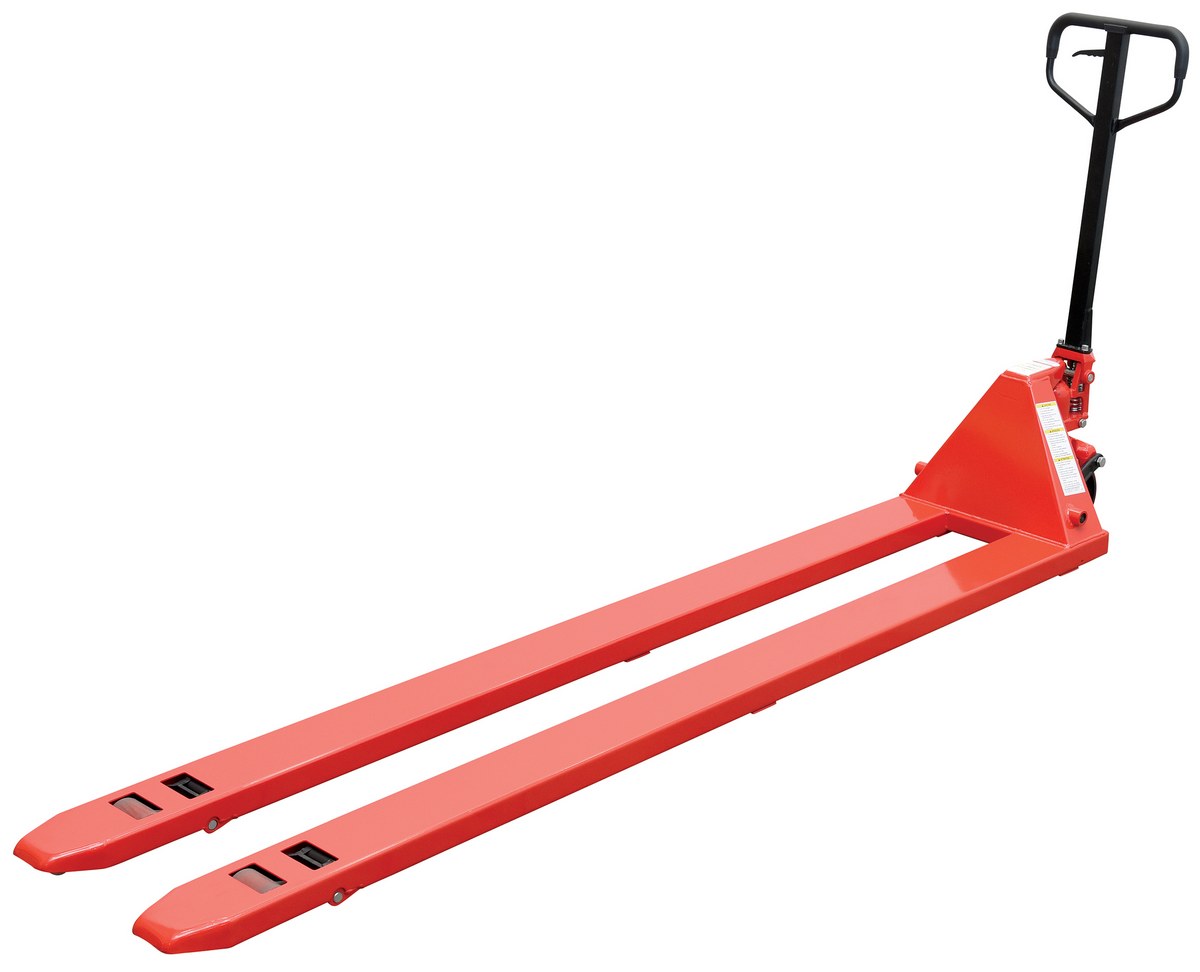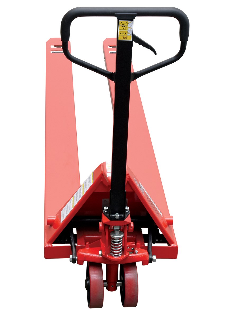 Steel Low Profile Pallet Truck 112 In. x 20-5/8 In. x 48 In. 4000 Lb. Capacity RedAn economical way for one person to move heavy pallet loads without the use of a fork truck! Includes two articulating steering wheels and two front load rollers. Ergonomic design requires only 75 pounds of pulling force when fully loaded. Steering wheels include bearing dust covers for added life. Nose wheels are located on the front edge of each fork to assist in clean pallet entrance and exit. Reinforced triple-formed steel forks provide twice the strength of standard single-formed forks. Equipped with internally mounted solid steel adjustable push rods. Spring loaded handle automatically returns to vertical position when not in use. Hydraulic pump design facilitates easy-access seal replacement. Chrome-plated hydraulic pump piston for long seal life.