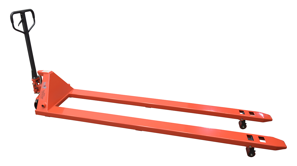 The full featured pallet truck is an economical way for one person to move heavy pallet loads without the use of a fork truck! Includes two (2) articulating steering wheels and two (2) front load rollers. The ergonomic design requires only seventy-five (75) pounds of pulling force when fully loaded. Steering wheels include bearing dust covers for added life. Nose wheels are located on the front edge of each fork to assist in clean pallet entrance and exit. Reinforced triple-formed steel forks provide twice the strength of standard single-formed forks. The unit is equipped with internally mounted solid steel adjustable push rods. The spring loaded handle automatically returns to vertical position when not in use. Hydraulic pump design facilitates easy-access seal replacement. Chrome-plated hydraulic pump piston for long seal life.