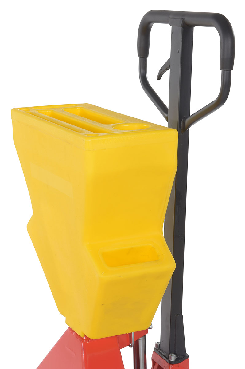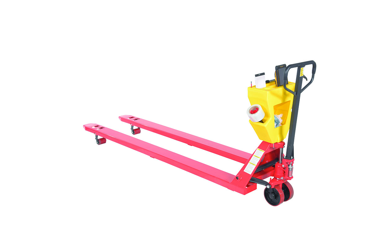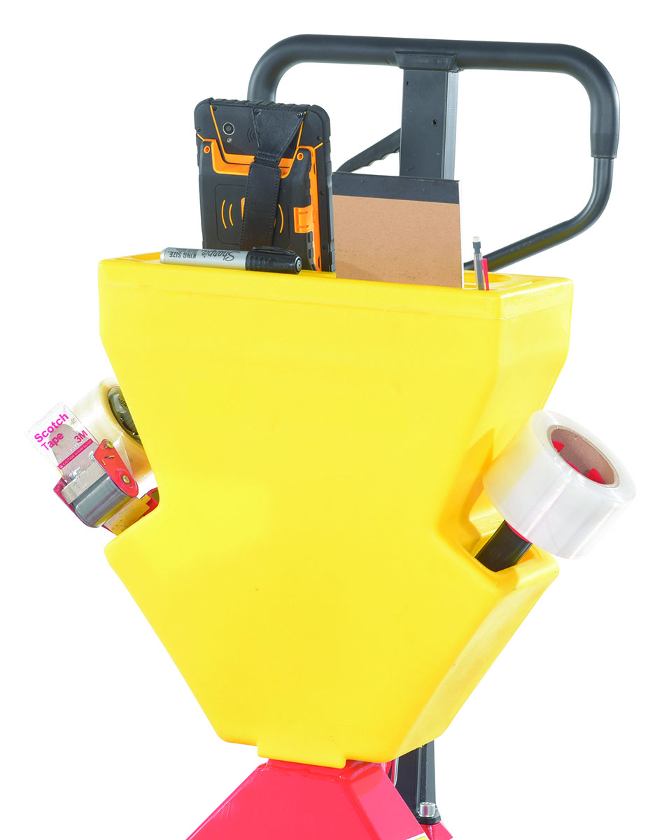 A pallet truck with a storage caddy is the perfect bundle of two innovative products. The pallet truck has an ergonomically friendly design with a limited pulling force required, while the caddy allows the user to be more organized and efficient. With a strong powder coated steel construction, the pallet truck moves easily between areas. Nose wheels are located on the front edge of each fork to assist in clean pallet entrance and exit. A molded plastic design allows the caddy to be durable throughout consistent daily use. Installation hardware and instructions included.