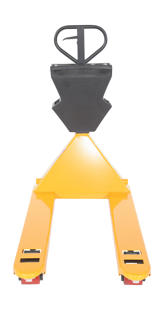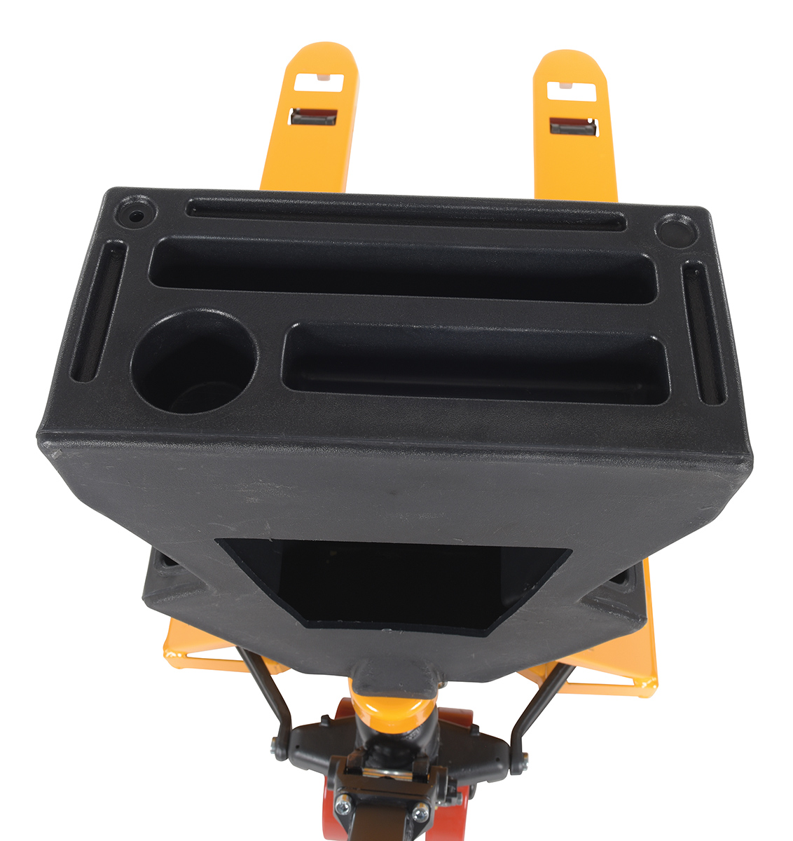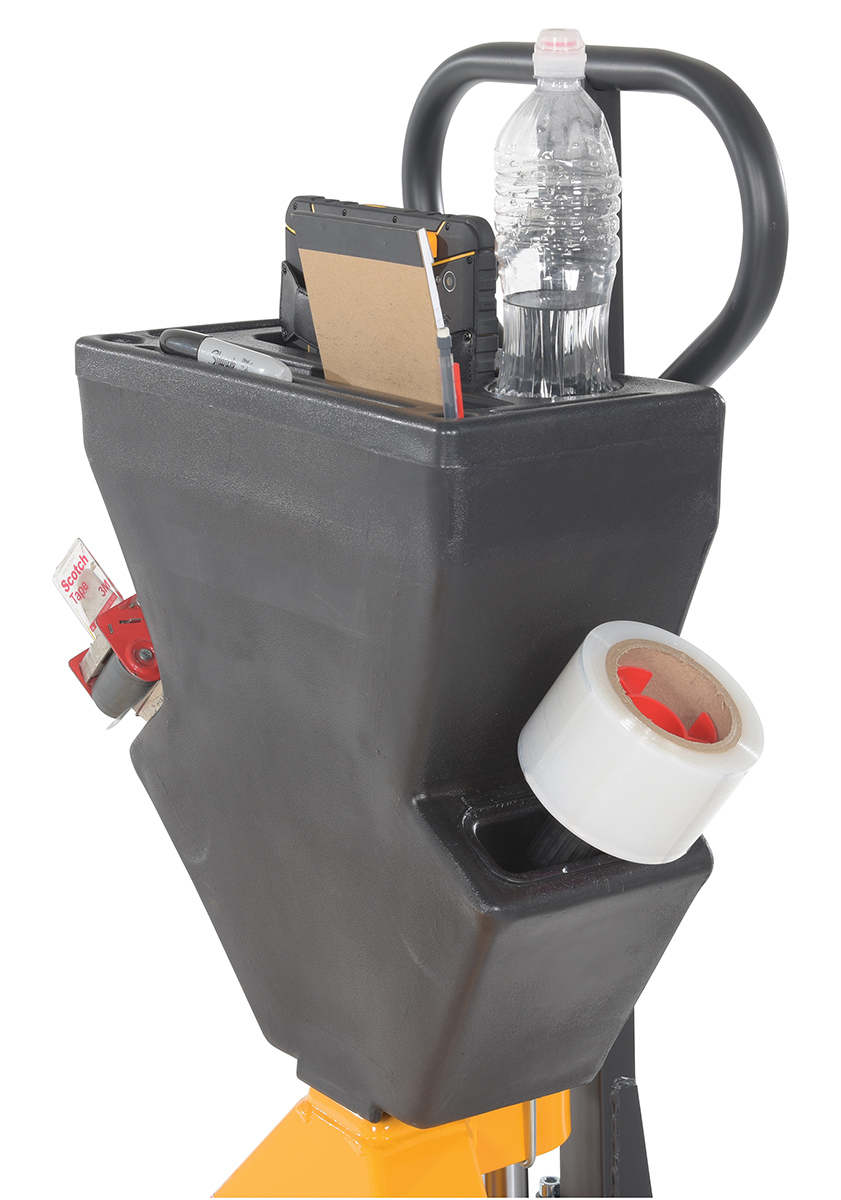 Steel/Plastic Pallet Truck 61-3/16 In. x 27 In. x 48 In. 5500 Lb. Capacity Yellow with Black P-CaddyA pallet truck with a storage caddy is the perfect bundle of two innovative products. The pallet truck has an ergonomically friendly design with a limited pulling force required, while the caddy allows the user to be more organized and efficient. With a strong powder coated steel construction, the pallet truck moves easily between areas. Nose wheels are located on the front edge of each fork to assist in clean pallet entrance and exit. A molded plastic design allows the caddy to be durable throughout consistent daily use. Installation hardware and instructions included.