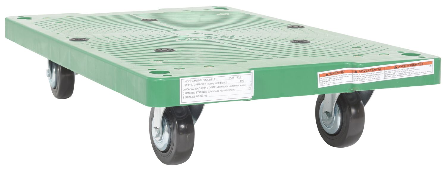 Polyethylene Dolly 30 In. x 18 In. x 6-5/16 In. 500 Lb. Capacity GreenThis plastic dolly is one (1) piece molded polyethylene. It is very lightweight and easy to clean. Will not rot, warp, dent, or splinter like wood dollies. Ideal for the food service industry. Unit comes standard with poly-on-poly casters.