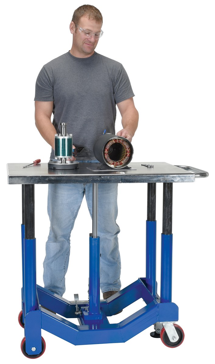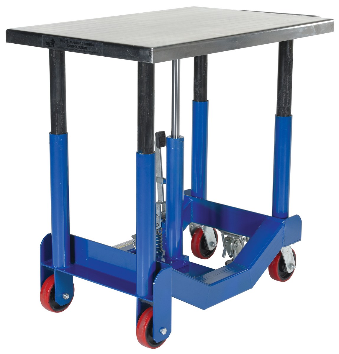 Hydraulic post tables are ideal in material handling facilities. The unit can be of use in a variety of environments from lifting dies and castings to moving machine parts. The corner posts are telescoping to help stabilize and fully support the load during operation. The tables roll smoothly on two (2) locking swivel casters with brakes and two (2) rigid. The tables can be lifted/lowered with a single speed foot pump, two-speed foot pump, two speed auto shifter that automatically shifts when the table is loaded, or linear actuated power.