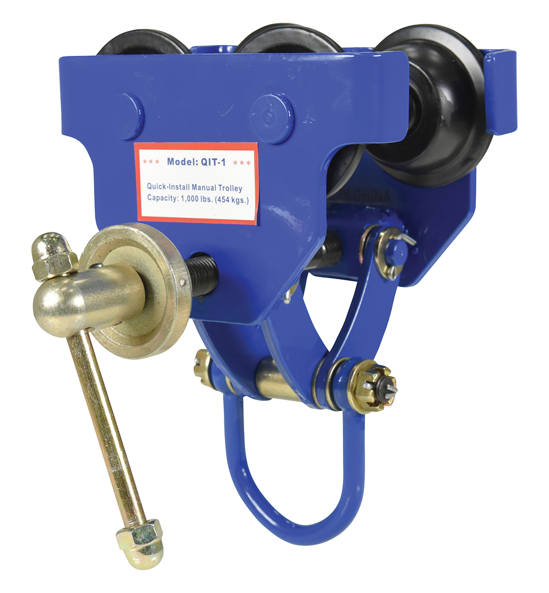 Steel Quick Install Manual Trolley 6-3/4 In. x 11-3/4 In. x 10-1/4 In. 1000 Lb. Capacity BlueThis quick install manual trolley is dependable, easy and safe to use. Designed to easily adjust to the width of virtually any S, H, W and M type I-beam. Width is adjusted with manual screw mechanism. Includes locking ring to prevent trolley width from changing accidentally. Manual screw mechanism may also be tightened to prevent trolley from moving (similar to a beam clamp). Each trolley includes four (4) rollers with sealed bearings for long life. A lifting eye is located at the bottom of the trolley for attaching a hoist (not included).