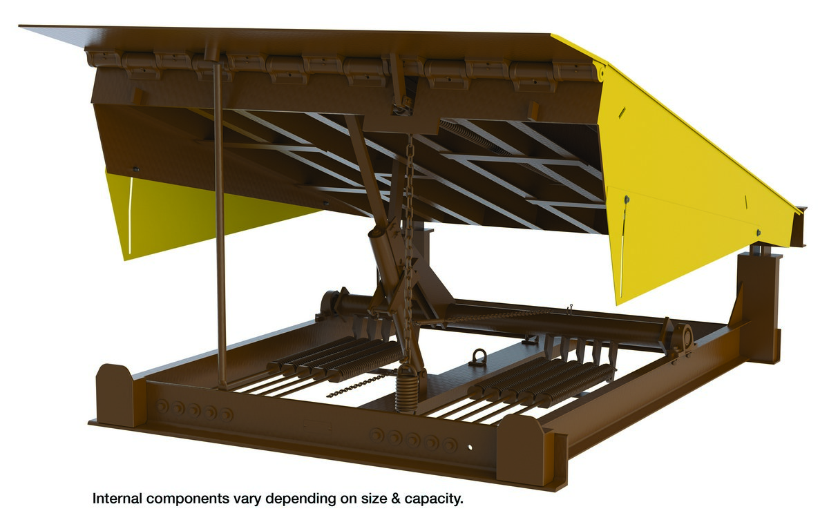 Steel Pull Chain Mechanical Dock Leveler 86"W x 110"L x 24"D Pit Dimensions 40000 Lb. Capacity Brown/YellowThe mechanical dock leveler is constructed of heavy duty checkered plate deck steel for long term support of the steel channel understructure. The dock leveler allows for easy truck loading and unloading. The leveler is engineered and designed for minimum maintenance and features a smooth pull chain operation.