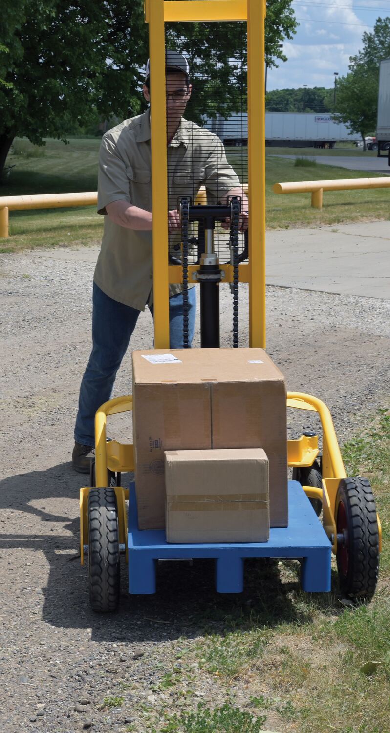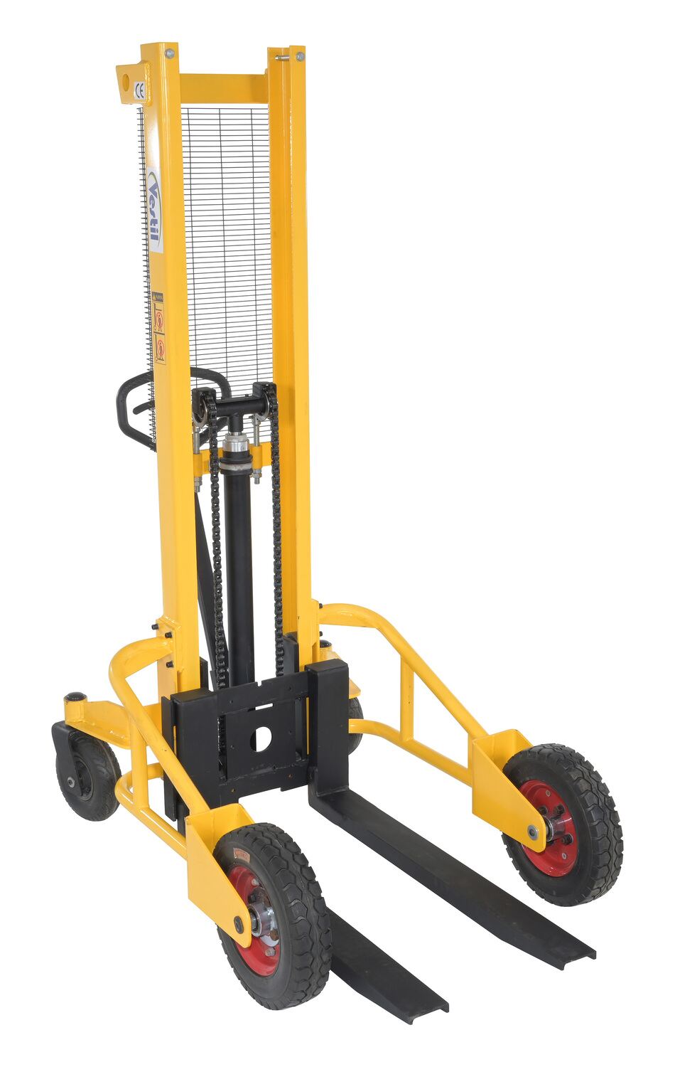 A rough terrain stacker is capable of going where other stackers can't. The narrow design provides precise movement in condensed areas. A handle pump design lifts and lowers, without the need for mechanical power. Just a simple hydraulic action leads the forks up or down to the desired height. The rubber tires provide stability when traversing rough or uneven surfaces. Baked in yellow powder coat finish.