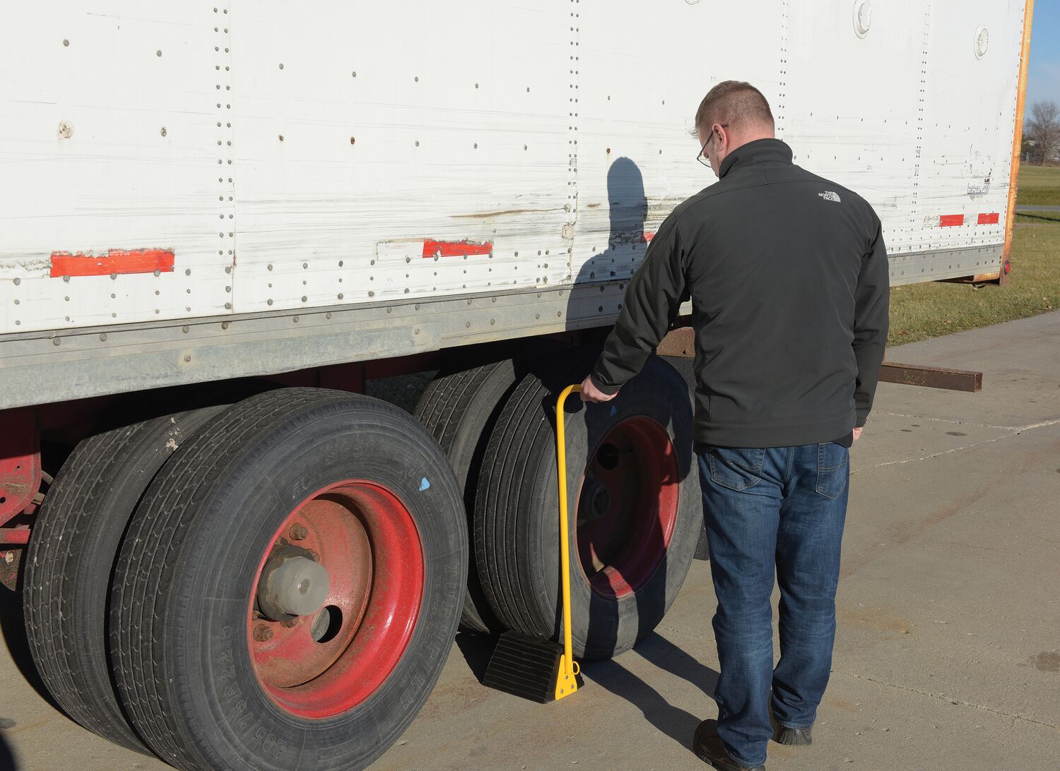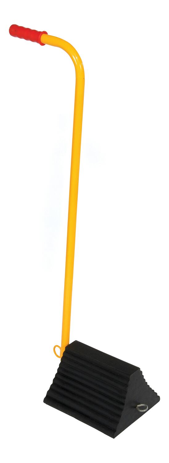 The ergo-handle Wheel Chock has an ergonomic design that makes it easy to move wheel chocks in and out of position under trailer wheels. It reduces the risk of back, knee, and foot injuries. The handle is constructed of steel and has a yellow powder coat finish. Hardware included. Assembly required. D-ring provided for attaching security chain. Chain not included.