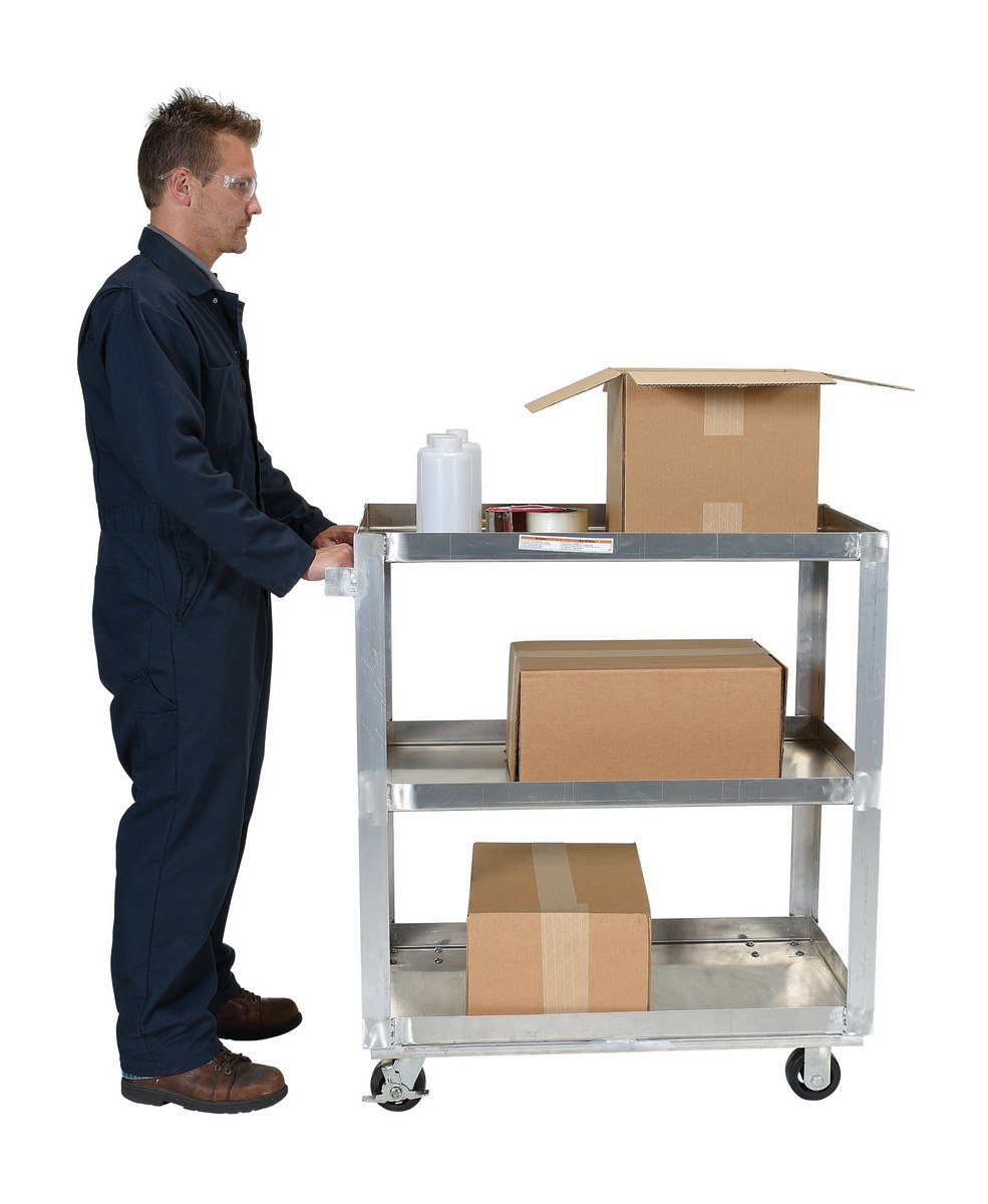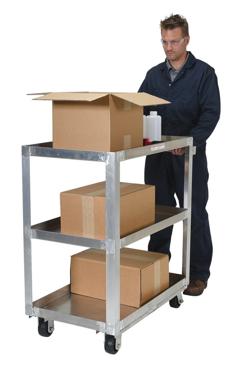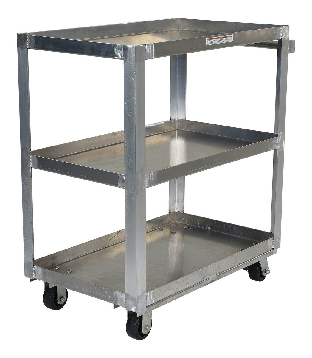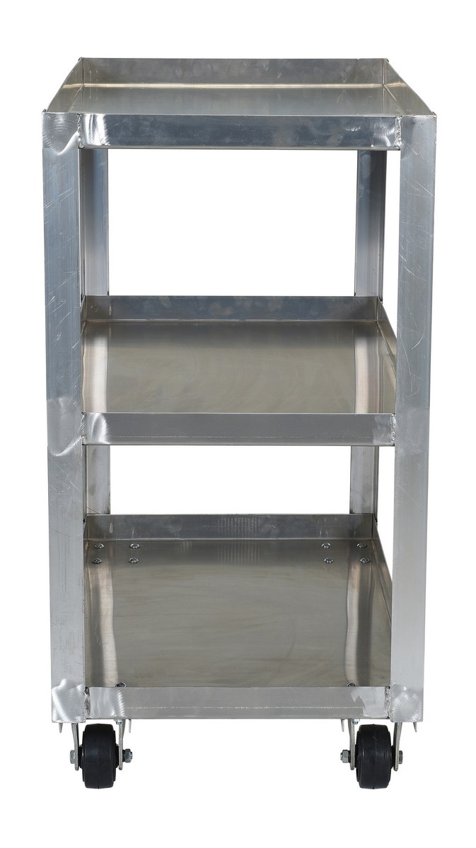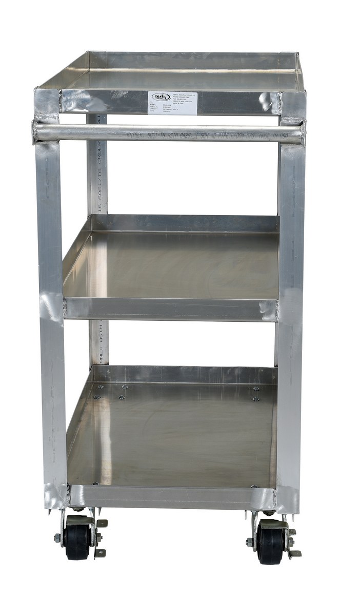 All welded service cart, made of aluminum is ideal for transporting parts and boxes. This unit has three (3) shelves, a lip is turned up on all shelves to prevent items from sliding off.