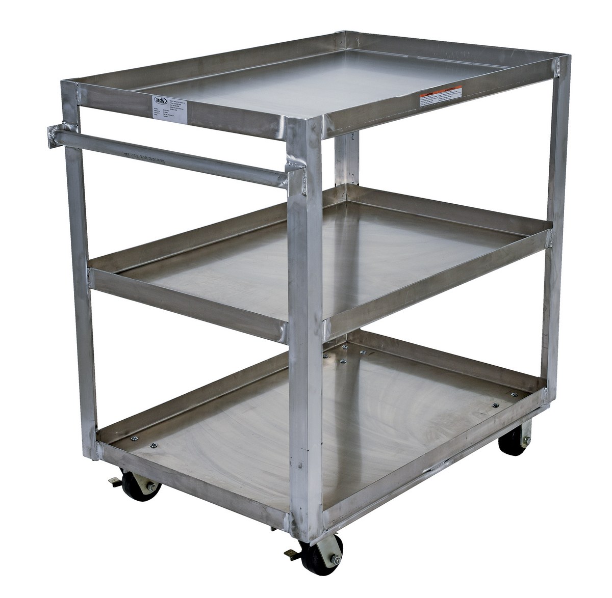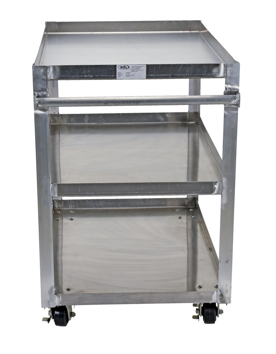 All welded service cart, made of aluminum is ideal for transporting parts and boxes. This unit has three (3) shelves, a lip is turned up on all shelves to prevent items from sliding off.