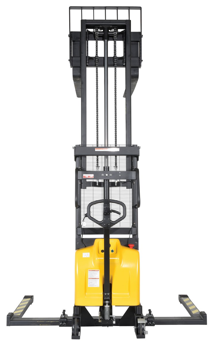 Steel/Plastic Hand Pump DC Powered Stacker with Adjustable Forks and Legs 98 In. Raised Height 2,000 Lb. Capacity Black / YellowAn economical alternative DC powered lift stacker. Ideal for maintenance and commercial applications. This unit can be used as manual hand pump lift or electric powered lift. Ideal when power is not available. High quality hydraulic pump and DC lift system. Compact design and strong steel construction. An economical lift to handle tasks such as transporting dies, molds, and skids. Powered with two (2) 12V AGM batteries. Integral battery charger, battery level gauge, and adjustable lowering speed. All models are easily maneuverable using the standard pull handle. Forks measures 26." wide by 42" long. Individual forks are 6" wide.