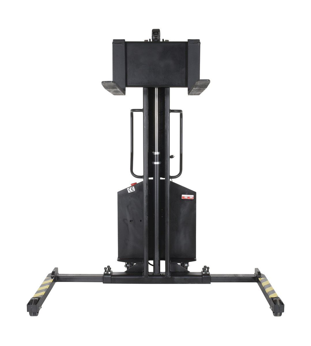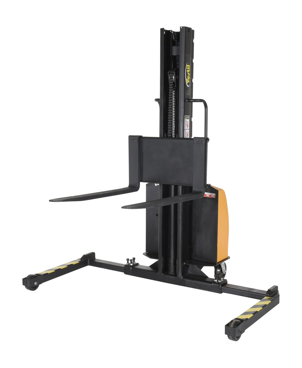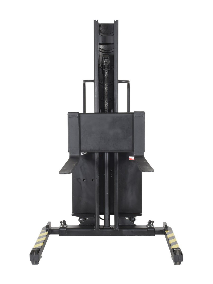 Steel Narrow Mast Stacker DC Powered 63 In. Raised Height Adjustable Forks and Support Legs 1,500 Lb. Capacity Yellow