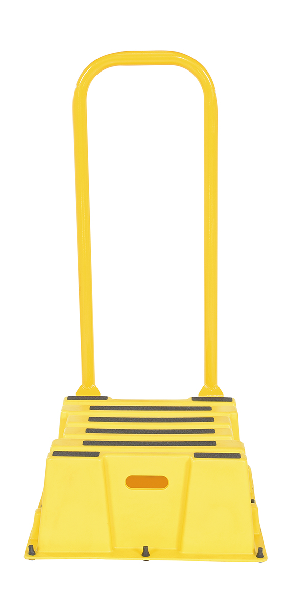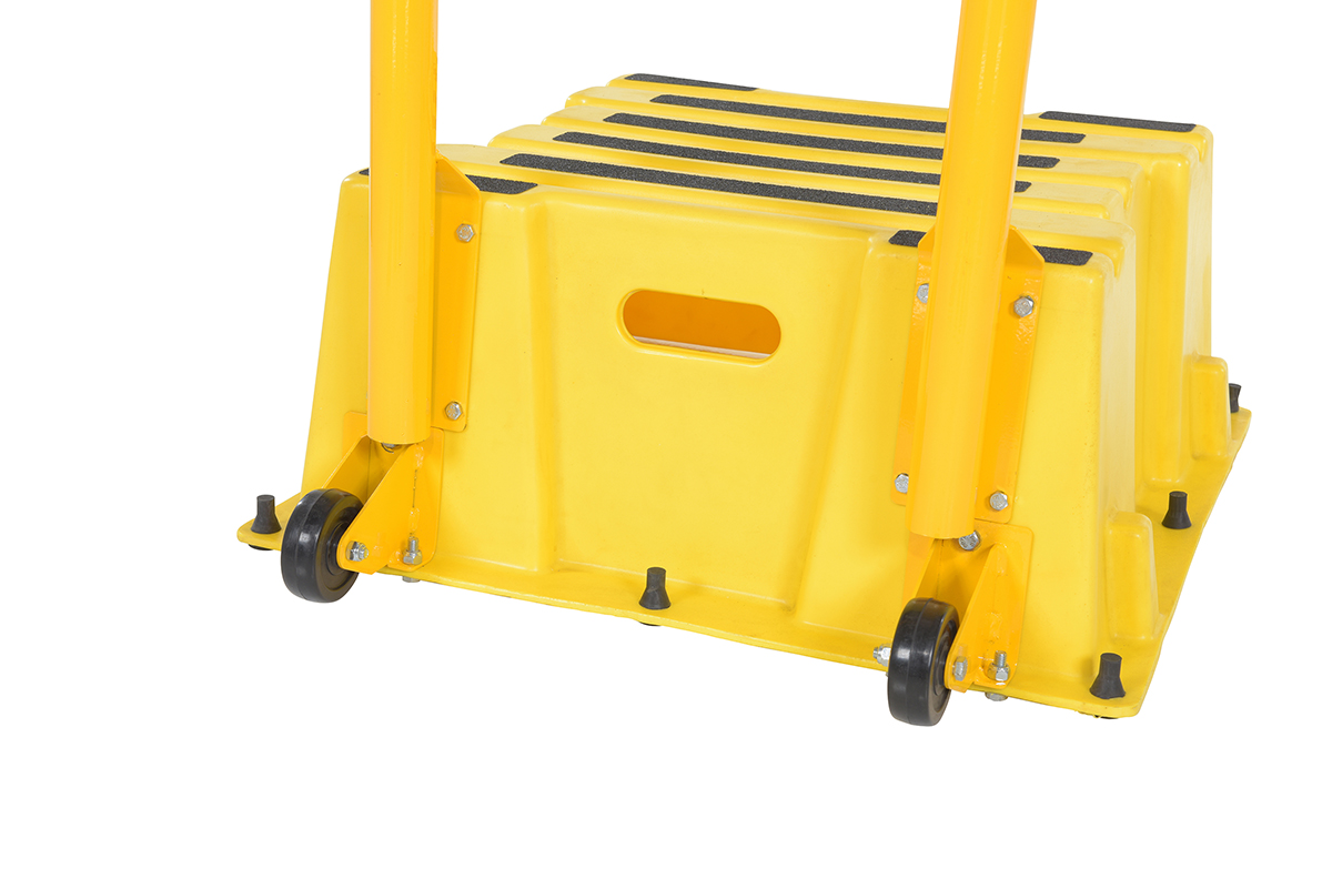 Polyethylene Nestable with Handrails Casters 1 Step 500 Lb. Capacity YellowA poly step stool is a great asset for on the go or in a permanent setting. A lightweight design with front and side cutout handles, allow the user to easily transfer the stool to a preferred spot. The taped step surfaces ensure safe footing while traversing up and down the steps. Includes bolt on handrail and casters. The hand rails height allows the unit to be pushed or pulled into the desired position, minimizing bending and twisting by the user. Steps can be nested to minimize footprint when not in use.