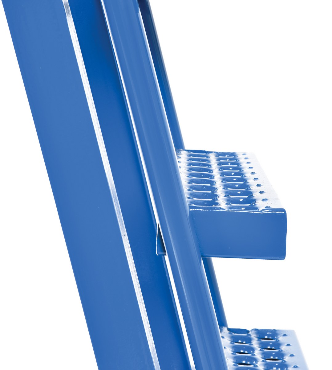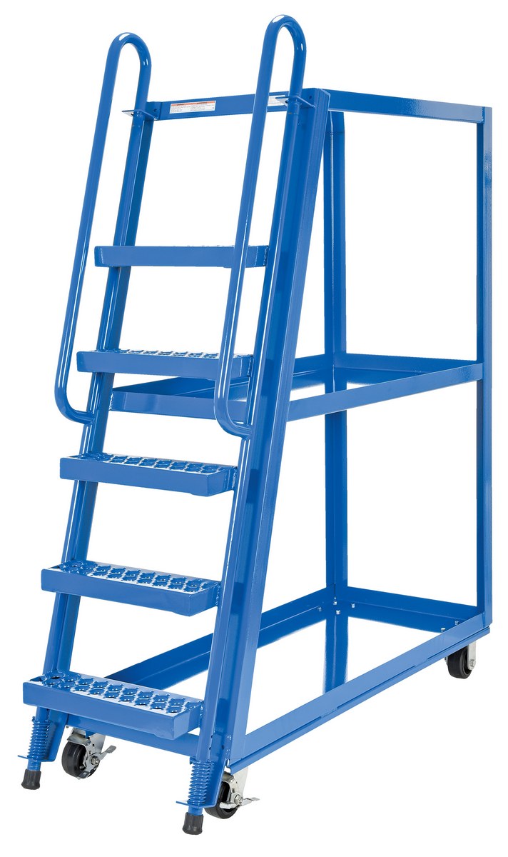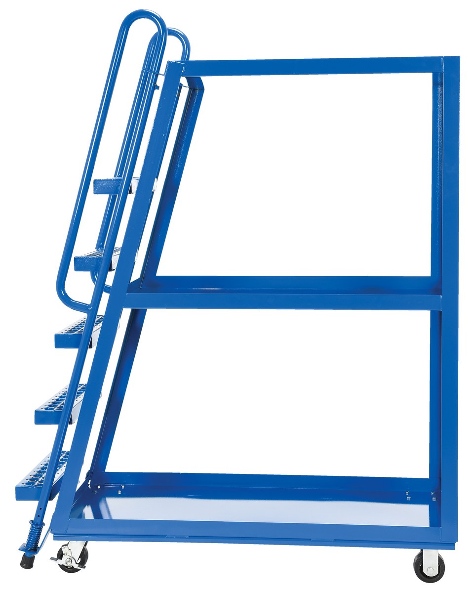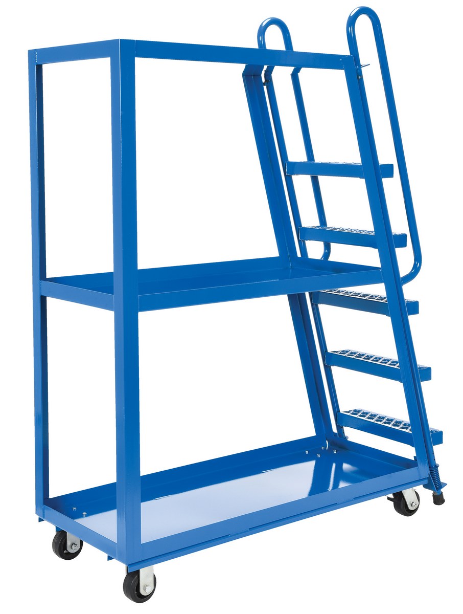 This oversized hi-frame stock picker truck is perfect for large jobs. Ideal for oversized cartons, boxes, parts, and supplies. A spring loaded steel ladder for sure, safe climbing, and loading. Steps have non-skid footing with self-cleaning surface. This stock picker truck has three (3) shelves. Built of durable steel construction. This unit is powder coated a blue finish.