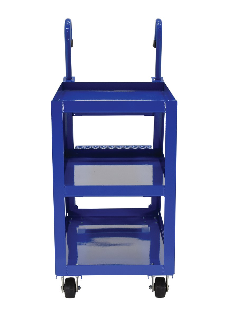 Steel Stock Picker 3 Shelf with Mold On Rubber Casters 39-3/4 In. x 21-7/8 In. x 50-1/8 In. 1,000 Lb. Capacity BlueCombine the mobility of a cart with the versatility of a step ladder with this stock picker truck. Convenient spring loaded steel step ladder holds the cart securely in place while a person is standing on the ladder. Crutch tip ladder prevents the cart from moving while stocking. Springs then return the ladder to the raised position once personnel exit the step. All shelves have the lip turned up to prevent items from falling off.