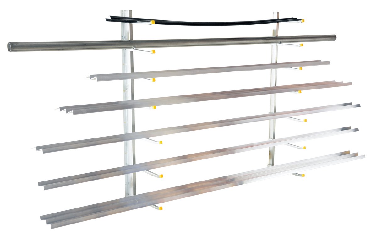 Steel Wall Mounted Material Rack 18-5/16 In. x 2-3/16 In. x 60 In. 1,000 Lb. Capacity SilverThis economical material rack is a wall mounted unit with dual supports. It comes with three (3) long arms and four (4) short arms. The bright zinc plating provides a long term, attractive appearance.