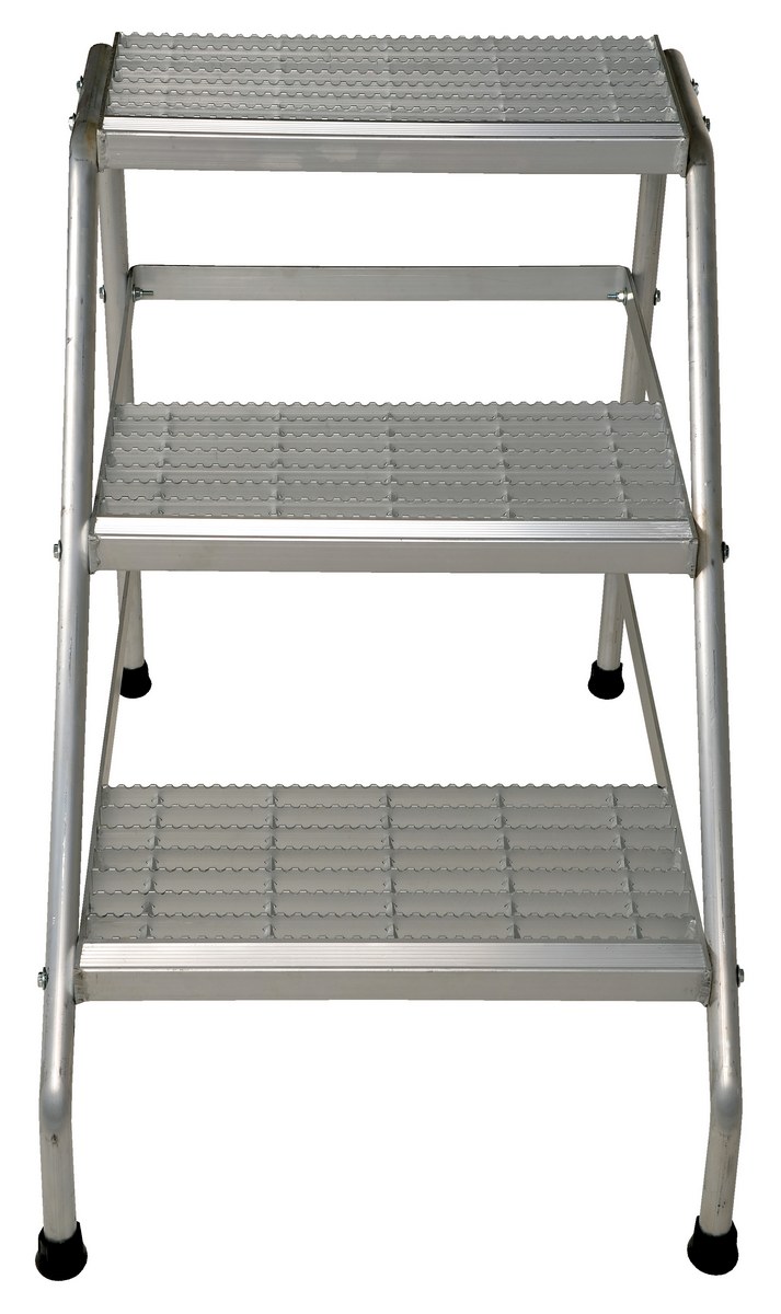 This Aluminum step stand is ideal for industrial or commercial applications. It is lighter than comparable steel models. Open step design includes extra heavy duty serrated surface for traction. With rubber tipped legs, this step ladder is ideal for use on many types floors.